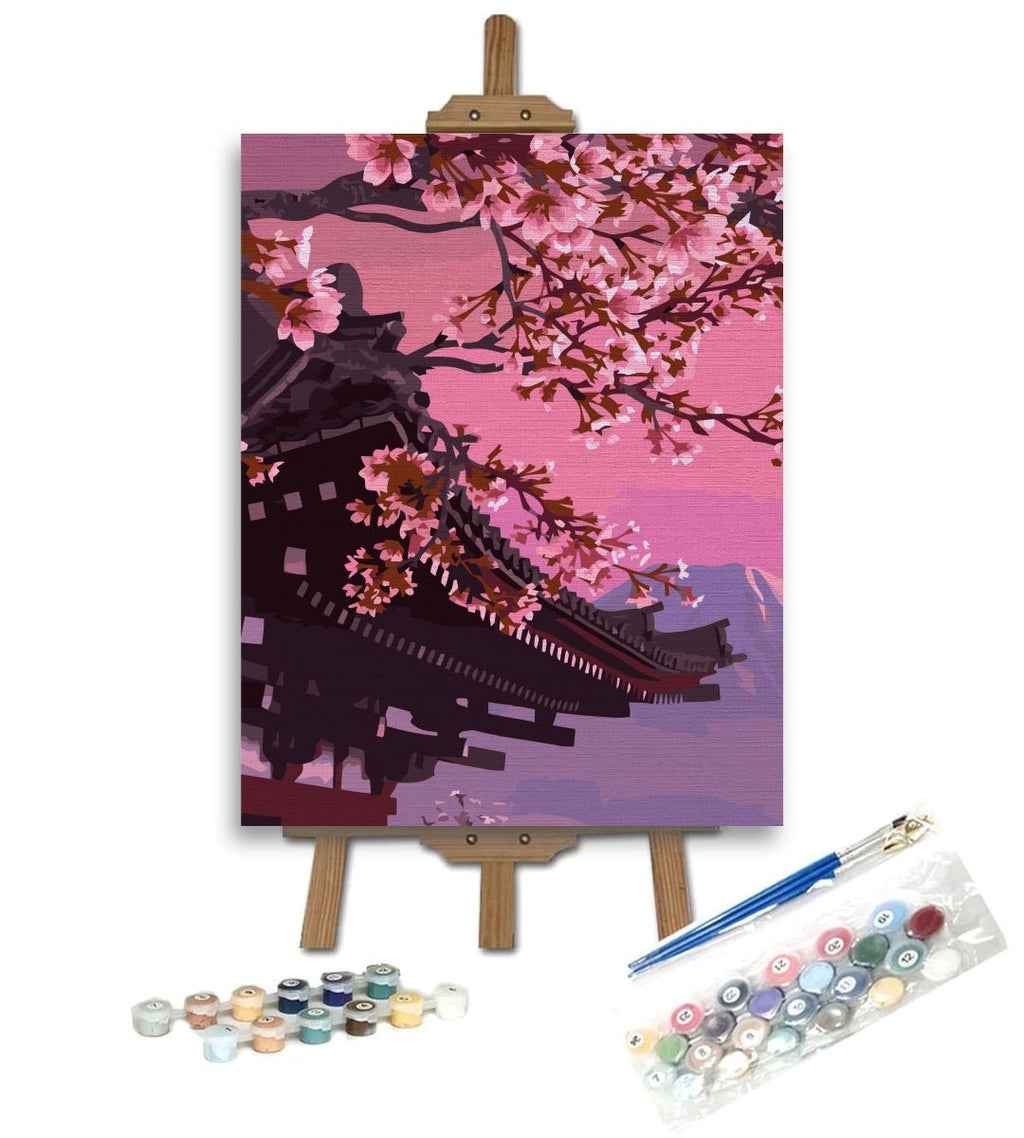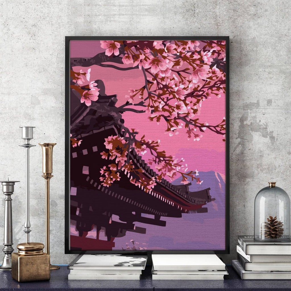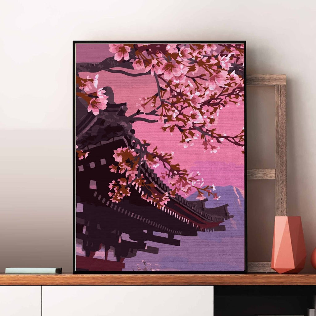 Sakura, floarea de cireș japonez, este vedetă în această pictură pe numere. I s-a dus vestea că este de o frumusețe rară, iar aici frumusețea sa îi este amplificată de cadrul specific și scăldată în nuanțe de roz și roșu.