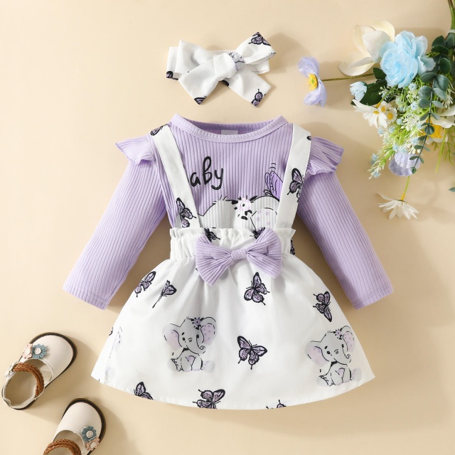 Marimi: 0-3, 3-6, 6-9, 9-12, 12-18 luni Material: 95% bumbac, 5% spandex Costumas pentru fetite format din: - body lila cu maneca lunga, cu un elefantel dragals imprimat pe piept, se inchide cu capse intre picioruse; - sarafan alb, imprimat cu fluturasi mov. - bentita asortata cu sarafanul. Pantofiorii din imagine sunt cu titlu de prezentare si nu sunt inclusi in pret. INTRETINERE: Se spala la masina la 40° impreuna cu alte culori similare si se calca pe dos. Nu se aplica inalbitori si nu se usuca la masina. Culorile produselor pot varia in functie de monitorul calculatorului si calibrarea acestuia.