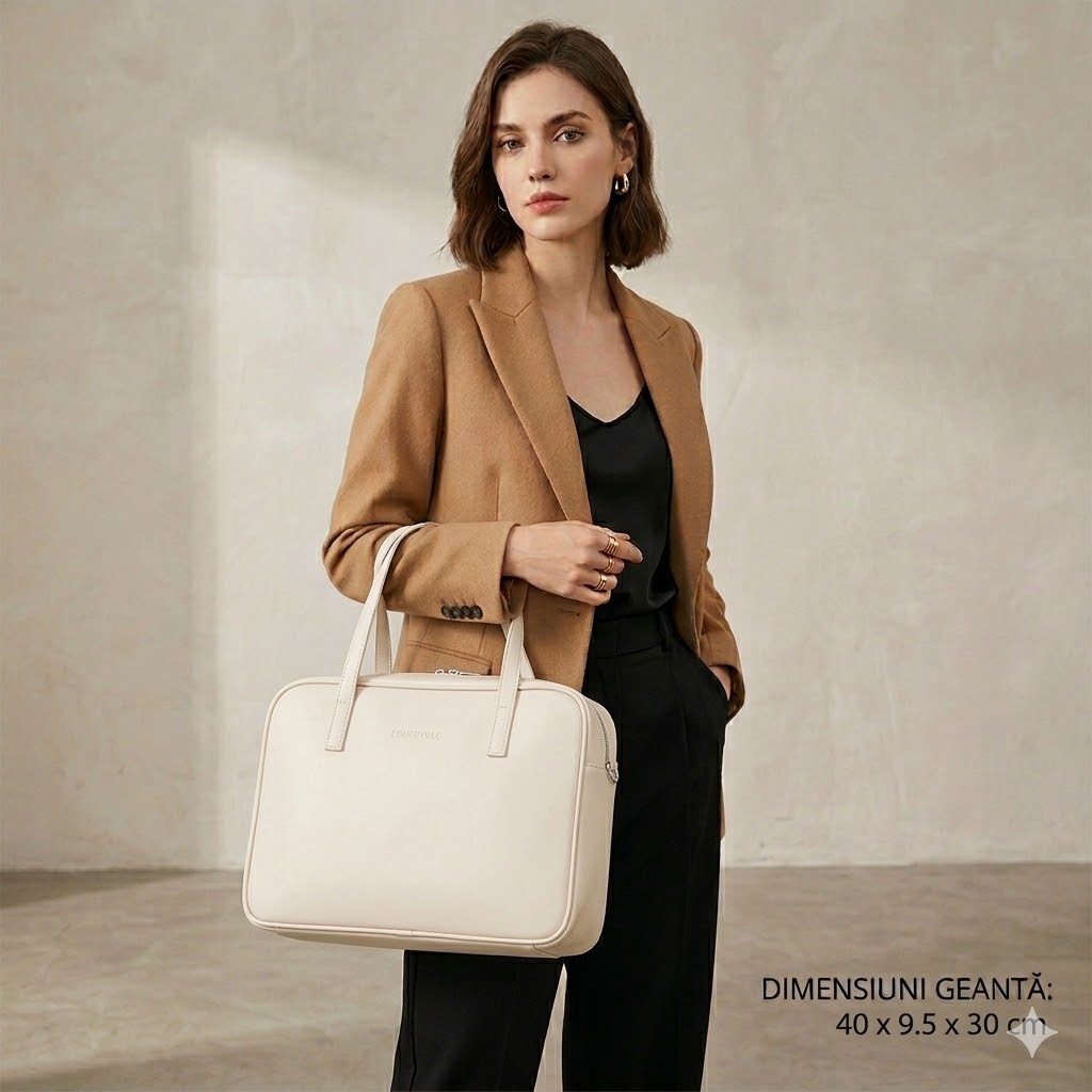 interior captusit; 1 compartiment principal; 1 compartiment antisoc pentru laptop; 1 buzunar interior cu fermoar; material: piele ecologica; dimensiuni: 40 x 9.5 x 30 cm. Important : Culoarea produsului poate varia ușor datorită luminozității monitorului. Din cauza varietății instrumentelor de măsură, pot exista ușoare erori de cm.