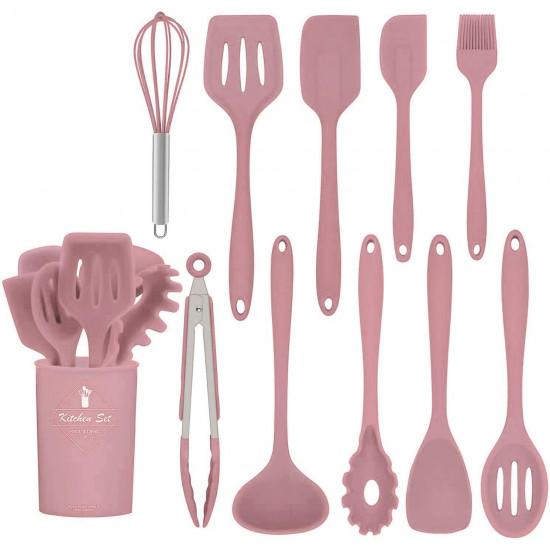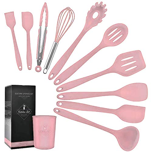 Set 11 ustensile din silicon, pentru gatit - Roz 11 ustensile de bucatarie: Cleste, Tel, Pensula, Lingura cu fante, turner cu fante, Ustensila paste, Lingura, Spatula, Lingura, Turner solid, Ustensila de ciorba. Acest set va va satisface toate nevoile de gatit. SILICON ALIMENTAR - Siliconii de calitate alimentara pot rezista la temperaturi de 446 ° F / 230 ° C, daca le lasati accidental in oala pentru o perioada de timp, nu trebuie sa va faceti griji cu privire la topirea lor. Siliconii alimentari nu vor reactiona cu alimente sau bauturi si nu vor produce vapori periculosi. PROTEJATI CAPUL MASINII DE SPALAT VASE - Capul din silicon alimentar nu va zgaria sau deteriora tigaile antiaderente, tigaile metalice si ustensilele metalice. Acest lucru ii face foarte prietenosi atunci cand se ocupa de suprafete antiaderente. PROIECTARE SET ERGONOMIC - Setul nostru de ustensile de bucatarie din silicon este proiectat ergonomic si usor de utilizat. Fiecare recipient are o forma perfecta datorita functiei sale unice. In plus, puteti utiliza cosul de depozitare pentru a organiza si depozita ustensilele de gatit. USOR DE UTILIZAT SI DE CURATAT - Vesela din silicon este rezistenta la pete. Acest lucru se datoreaza naturii neporoase a siliconului. Cand amestecati alimente intunecate (cum ar fi alimentele cu rosii), probleme cu mirosul sau pigmentul. Acest lucru face, de asemenea, produsele din silicon usor de curatat sau de curatat