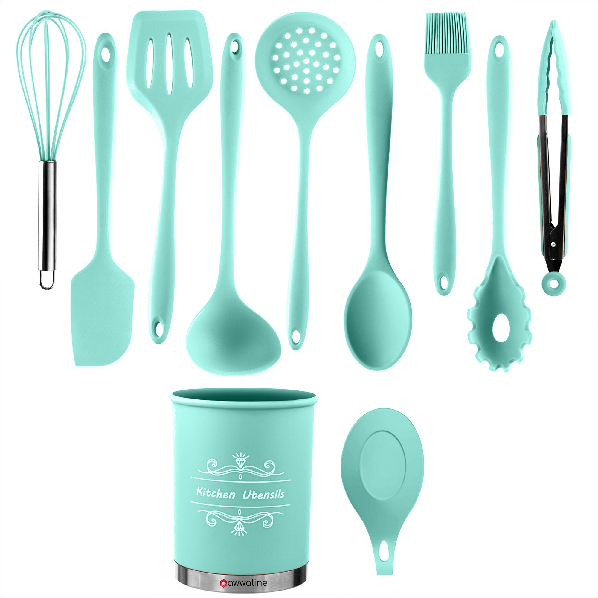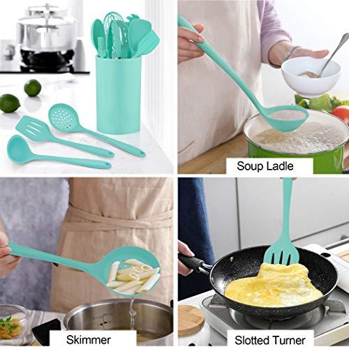 Set 11 ustensile din silicon, pentru gatit - Turcoaz 11 ustensile de bucatarie: Cleste, Tel, Pensula, Lingura cu fante, turner cu fante, Ustensila paste, Lingura, Spatula, Lingura, Turner solid, Ustensila de ciorba. Acest set va va satisface toate nevoile de gatit. SILICON ALIMENTAR - Siliconii de calitate alimentara pot rezista la temperaturi de 446 ° F / 230 ° C, daca le lasati accidental in oala pentru o perioada de timp, nu trebuie sa va faceti griji cu privire la topirea lor. Siliconii alimentari nu vor reactiona cu alimente sau bauturi si nu vor produce vapori periculosi. PROTEJATI CAPUL MASINII DE SPALAT VASE - Capul din silicon alimentar nu va zgaria sau deteriora tigaile antiaderente, tigaile metalice si ustensilele metalice. Acest lucru ii face foarte prietenosi atunci cand se ocupa de suprafete antiaderente. PROIECTARE SET ERGONOMIC - Setul nostru de ustensile de bucatarie din silicon este proiectat ergonomic si usor de utilizat. Fiecare recipient are o forma perfecta datorita functiei sale unice. In plus, puteti utiliza cosul de depozitare pentru a organiza si depozita ustensilele de gatit. USOR DE UTILIZAT SI DE CURATAT - Vesela din silicon este rezistenta la pete. Acest lucru se datoreaza naturii neporoase a siliconului. Cand amestecati alimente intunecate (cum ar fi alimentele cu rosii), probleme cu mirosul sau pigmentul. Acest lucru face, de asemenea, produsele din silicon usor de curatat sau de curatat