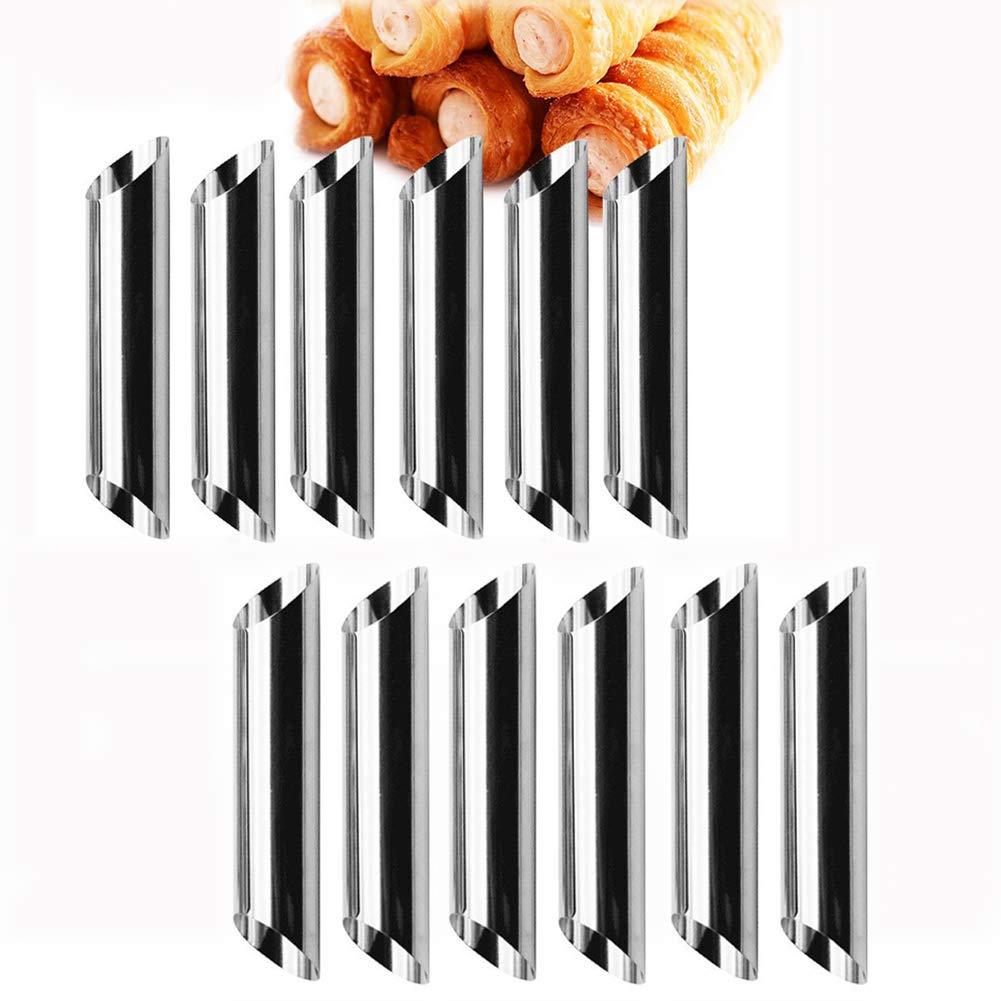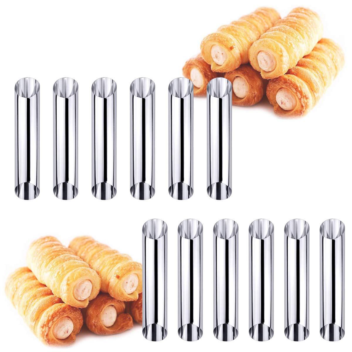 Set 12 forme cilindrice pentru prajituri Ajutorul tau de nadejde din bucatarie! Pentru a pregati aperitive sau deserturi cu aspect deosebit, aceste forme pentru rulouri sunt ideale. Prepara aluatul, ruleaza-l pe accesoriul de gatit si coace-l in cuptor. Dupa aceea il poti umple fie cu o compozitie dulce, fie cu una sarata. Forme tubulare pentru rulouri patiserie. Material: Otel inoxidabil. Set de 12 piese. Dimensiuni: L 8,5 cm, diametru 2,5 cm.
