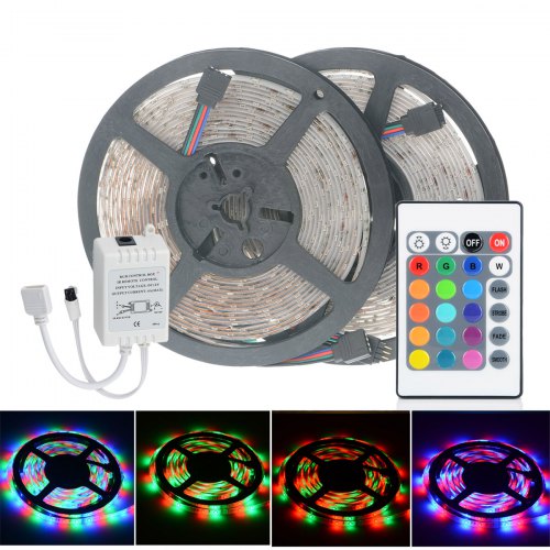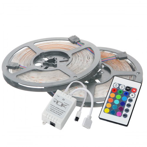Set 2 x Banda LED RGB multicolor cu telecomanda 5 M Banda LED 12 V cu controler si telecomanda wireless, utila pentru efectele sale speciale in iluminarea spatiilor interioare, dar si acvarii, pentru cei pasionati de tuning auto sau la realizarea de firme si casete luminoase. Cele 300 de led-uri multicolore asigura o lumina puternica, cu consum energetic redus si durata de viata mare (50.000 de ore). Banda flexibila este impermeabila la apa, iar led-urile sunt protejate de un strat de silicon. Aceste benzi se pot monta oriunde in autovehicul sau in casa, fiind alimentate la 12V. Specificatii tehnice banda LED RGB cu telecomanda: numar led-uri: 300 lungime: 5 metri culoare: multicolora + diverse programe voltaj: 12v putere: 14.4 watt / metru durata viata: 50000 ore Pachetul contine: 2 x banda 5 metri 2 x telecomanda wireless 2 x modul control 2 x transformator 220V / 12V / 2A