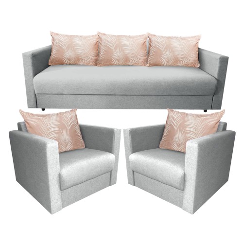 Setul 3+1+1 Croma este alcatuit dintr-o canapea cu 3 locuri si 2 fotolii fixe. Canapeaua Croma este o canapea moderna conceputa pentru un stil de viata activ fiind foarte usor de extins si de strans. Canapeaua Croma cu 3 locuri are brate inguste pentru o incadrare cat mai eficienta in camera pastrand suprafata generoasa de dormit atunci cand este extinsa. Canapeaua Croma este extensibila putand fi utilizata zilnic atat ca si canapea pentru petrecerea timpului liber cat si ca un pat generos pe timpul noptii. Suprafata de dormit este 140 * 190 cm. Canapeaua Croma are saltele cu plasa de arcuri (tip Relaxa) si burete de densitate mare pentru o rezistenta sporita in timp, iar datorita suprafetei plane care se formeaza atunci cand se extinde asigura un somn odihnitor pe timpul noptii. Atat canapeaua cat si pernele sunt tapitate cu stofa. Canapeaua Croma are o lada de depozitare generoasa foarte practica atat pentru lenjeria de pat, cat si pentru diverse obiecte pe care le folositi rar. Sezutul in varianta stransa are o latime generoasa de 70 cm si poate fi folosit de o persoana in timpul zilei pentru un pui de somn fara a mai fi nevoie sa extindeti canapeaua. Canapeaua Croma are 3 perne pufoase foarte utile pentru o sedere cat mai confortabila pe canapea, dar si pentru o pata de culoare. Canapeaua Croma este foarte usor de montat avand elemente de cuplare rapide. Canapeaua Croma este prevazuta cu un peretar prins intre brate care ramane la perete atunci cand canapeaua este extinsa si este folosita pentru dormit. Peretarul protejeaza peretele si asigura un confort sporit pentru persoana care va dormi la perete. Dimensiuni canapea Croma stransa: Lungime: 2110 mm Adancime: 990 mm Inaltime: 710 mm Suprafata de dormitor canapea Croma: 1400 x 1900 mm Fotoliul Croma este un fotoliu modern conceput pentru un stil de viata activ. Fotoliul Croma are saltea cu plasa de arcuri (tip Relaxa) si burete de densitate mare pentru o rezistenta sporita in timp. Atat fotoliul cat si perna sunt tapitate cu stofa. Fotoliul Croma are o perna pufoasa foarte utila pentru o sedere cat mai confortabila pe fotoliu, dar si pentru o pata de culoare. Fotoliul Croma este foarte usor de montat avand elemente de cuplare rapide. Dimensiuni fotoliu Croma: Lungime: 860 mm Adancime: 780 mm Inaltime: 700 mm