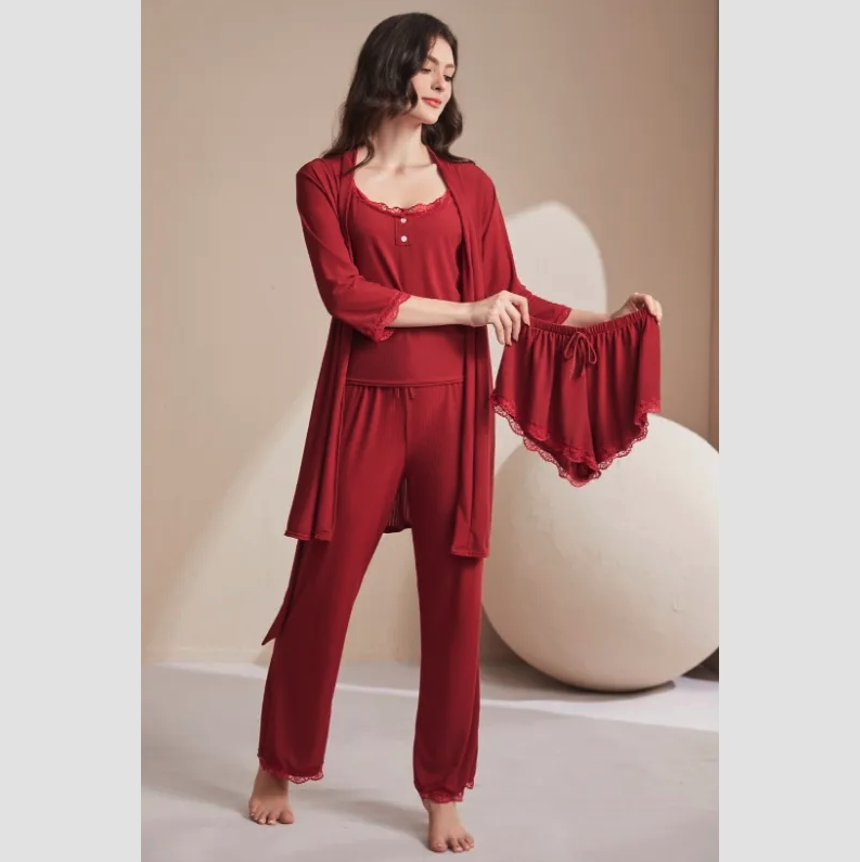 Set 4 piese, lenjerie dama Marimi disponibile: M, L, XL, XXL Pachetul este compus din: Maiou cu dantela si nasturi Camasa de noapte cu maneca lunga Pantaloni lungi Pantaloni scurti