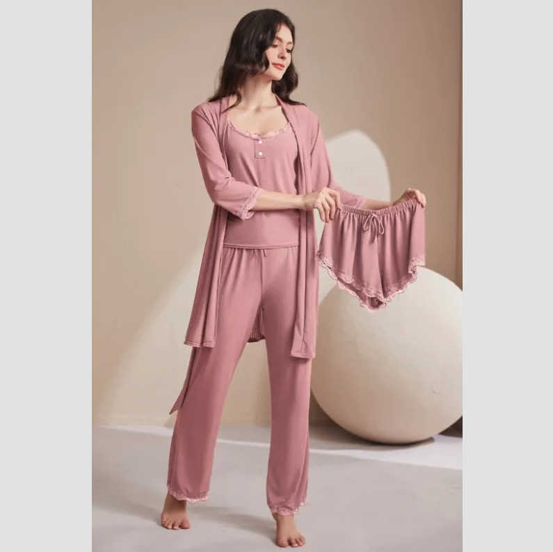 Set 4 piese, lenjerie dama Marimi disponibile: M, L, XL, XXL Pachetul este compus din: Maiou cu dantela si nasturi Camasa de noapte cu maneca lunga Pantaloni lungi Pantaloni scurti
