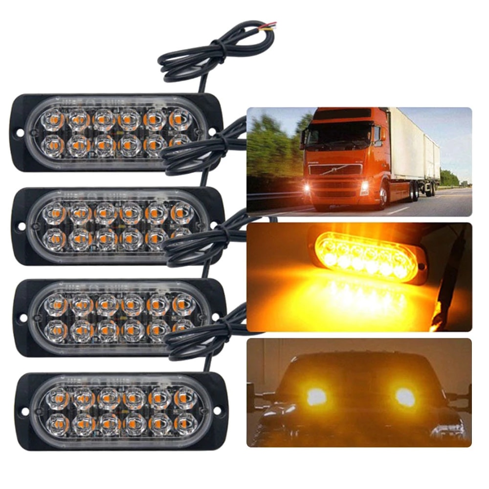 Set 4 x Stroboscop 12 LED, lumina portocalie Numar LED 12 Dimensiuni: 110 x 40 x 10 mm (Lungime x inaltime x adancime) Putere: 12W Temperatura lumina: 4300K Voltaj: 10-30V DC Clasa protectie: IP67 Material: Aliaj aluminiu Material lentila: Policarbonat Culoare corp: Negru Bracketi montaj: Otel inoxidabil Temperatura de functionare: -40°C - +80°C Durata de viata: ~ 30.000 ore Se recomanda montaj la electrician Are mai multe moduri flash Cele trei fire: negru -negativ, rosu-pozitiv si galben cand atinge negru schimba modul flash. Functionare usoara Cablu negru --- negativ Cablu rosu --- pozitiv Cablu galben --- lumina Modul blit se schimba atunci cand cablul galben este reconectat.