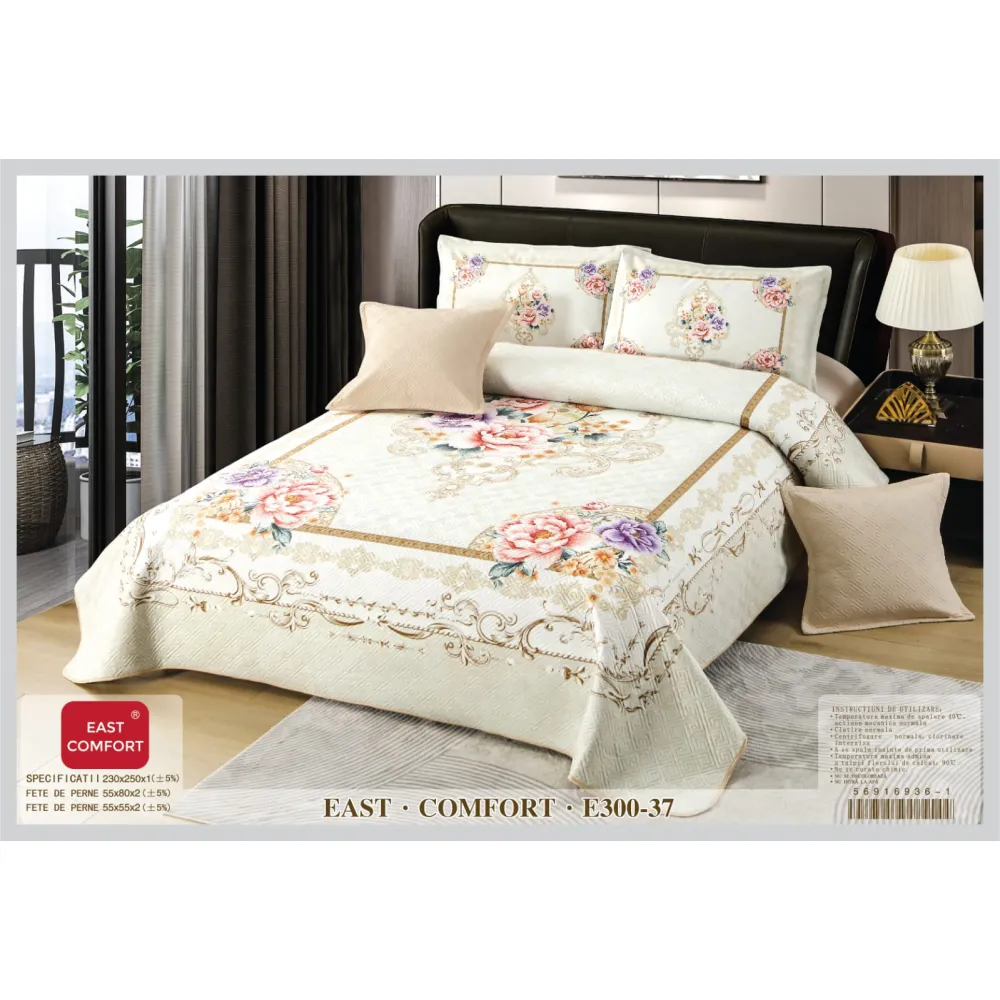 Set Cuvertura Pat Catifea Setul cu cuvertură pentru pat din catifea este o alegere elegantă și luxoasă pentru orice dormitor. Acest set include o cuvertură moale și matasoasă din catifea, care adaugă o notă de rafinament și confort suprem în camera ta. Catifeaua este cunoscută pentru textura sa fină și aspectul său strălucitor, ceea ce face ca acest set de cuvertură să fie atât de atractiv vizual. Setul cuvertură pentru pat din catifea poate aduce un element de glamour în decorul camerei tale, iar gama sa variată de culori îți permite să alegi cu ușurință nuanța care se potrivește cel mai bine cu stilul și paleta de culori a dormitorului tău. În plus, această cuvertură poate fi folosită pentru a proteja patul împotriva prafului și uzurii zilnice. Cuvertura din catifea nu este doar frumoasă din punct de vedere estetic, ci și confortabilă. Ea oferă o senzație plăcută la atingere și te învăluie într-un somn relaxant. Astfel, acest set reprezintă nu doar o alegere de design sofisticată, ci și o investiție în confortul și calitatea somnului tău. Pachetul cuverturii de pat contine 5 piese: Cuvertura 230 x 250 cm ± 5cm. 2 fete de perna 55 x 80 cm ± 5cm. 2 fete de perna 55 x 55 cm Intretinere cuvertura pat: Se spala la 30°C automat; Se calca la max 120°C; Nu se folosesc inalbitori chimici. Fetele de perna sunt in functie de cum este taiat materialul.