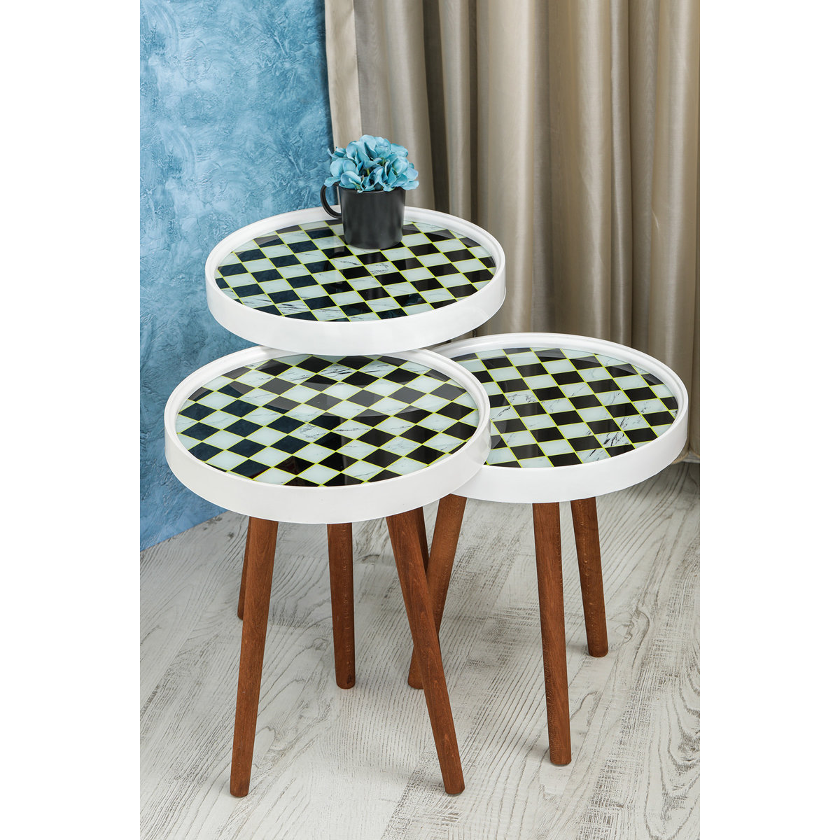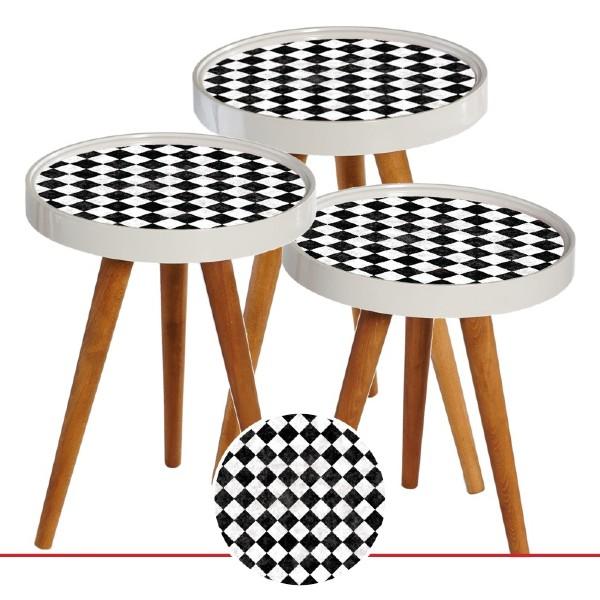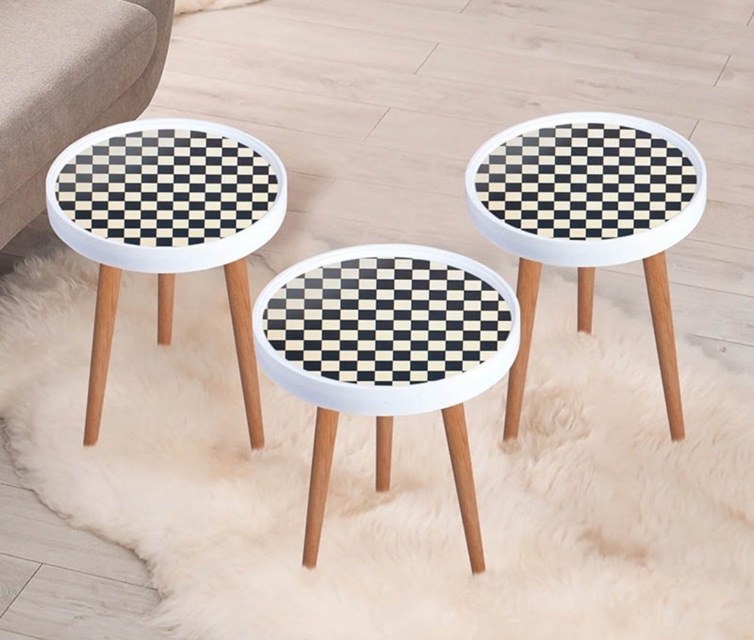 Set masute de cafea, design tabla de sah Model: Zigon Sehpa RS-170 diametru masute - 39 cm masuta mica inaltime - 44 cm masuta mijlocie - 50 cm masuta mare - 54 cm material: lemn, PVC, sticla greutate set complet: 10 kg