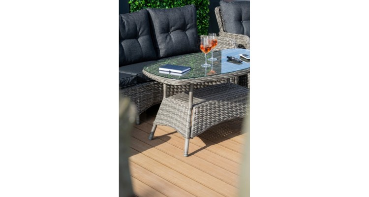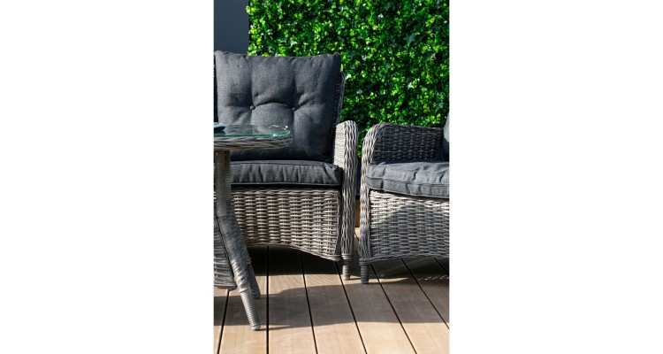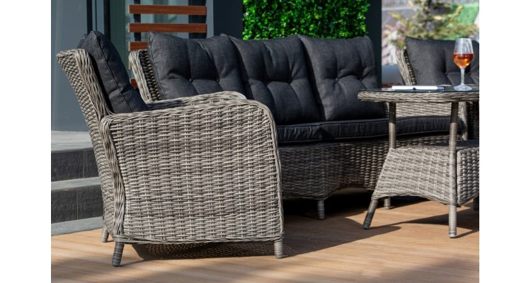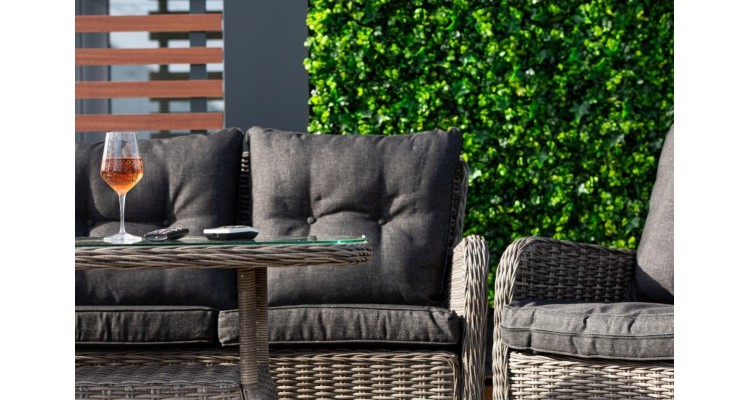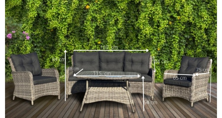 Confortabilul set de mobilier Ruby se potriveste perfect atat pentru gradina, terasa, cat si in interiorul casei. Setul Ruby format din doua fotolii o canapea si o masuta de cafea, realizate din impletitura de rattan de cea mai inalta calitate pe un cadru din aluminiu vopsit in camp electrostatic. Masa are blat din sticla. Materialele folosite in productia mobilei sunt usoare putand fi transportate si repozitionate fara probleme. In setul de mobilier sunt deasemenea incluse si perne (polyester) de culoare gri: 5 pentru sezut 5 pentru spatar Pernele au fermoar ceea ce permite scoaterea facila a fetei de perna la necesitate. Elementele din technoratan si aluminiu se curata usor doar cu ajutorul unei carpe umede: Setul contine: 1 x canapea cu 3 locuri 2 x fotoliu cu perna pentru sezut si spatar 1 x masa cu blat din sticla Mobilierul din ratan sintetic are urmatoarele caracteristici cheie: Design modern contemporan care combina confortul cu luxul Rattanul sintetic este stabilizat impotriva razelor UV astfel incat culoarea sa nu se estompeze sau ratanul sa putrezeasca Nu necesita intretinere speciala. O simpla stergere din cand in cand ii va mentine in stare perfecta Scheletul din aluminiu rezistent, usor si care face mobilierul usor de mutat Pernele de spate si sezut cu grosimea de 8 cm Masa cu sticla securizata cu grosimea de 5 mm
