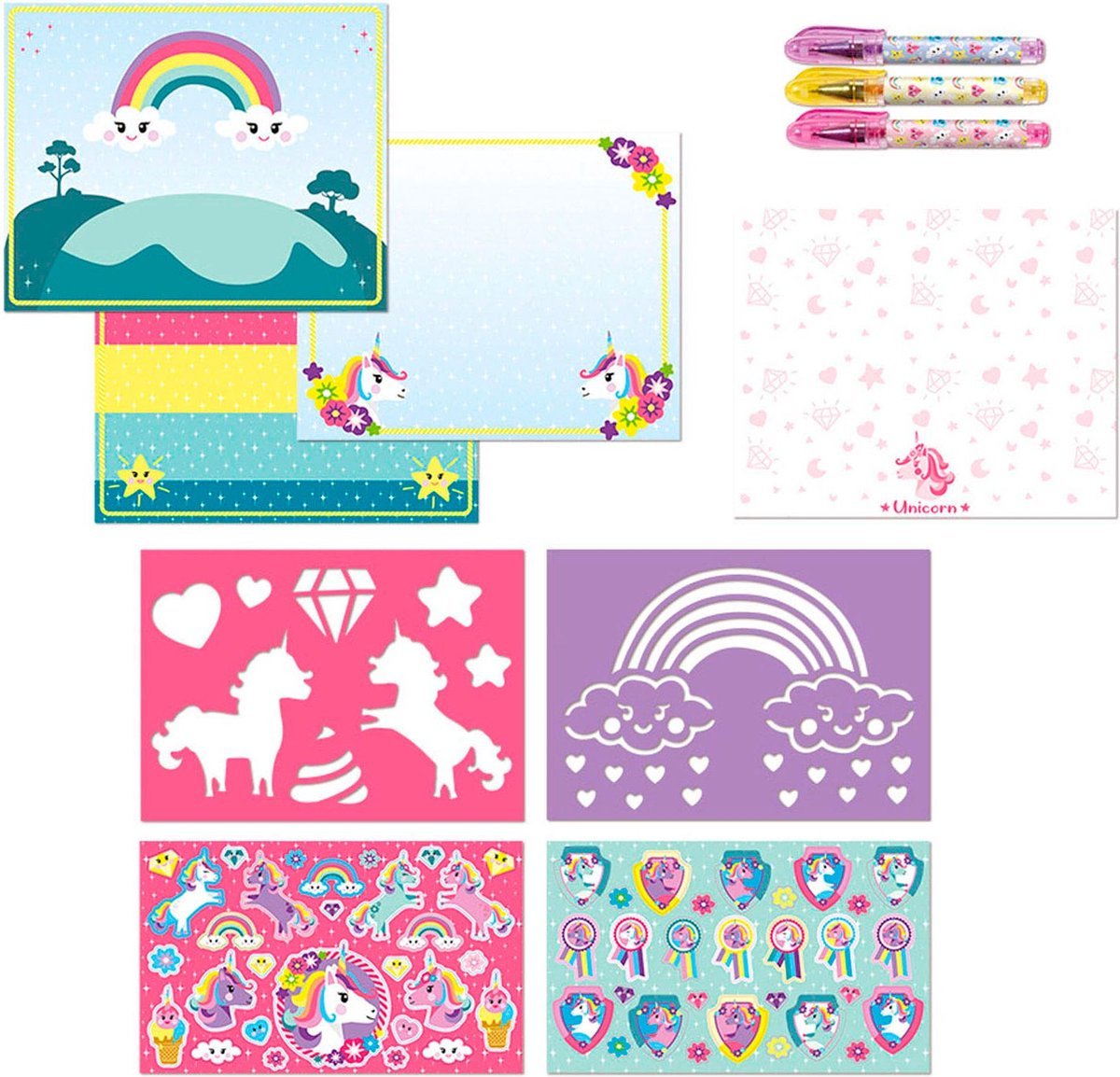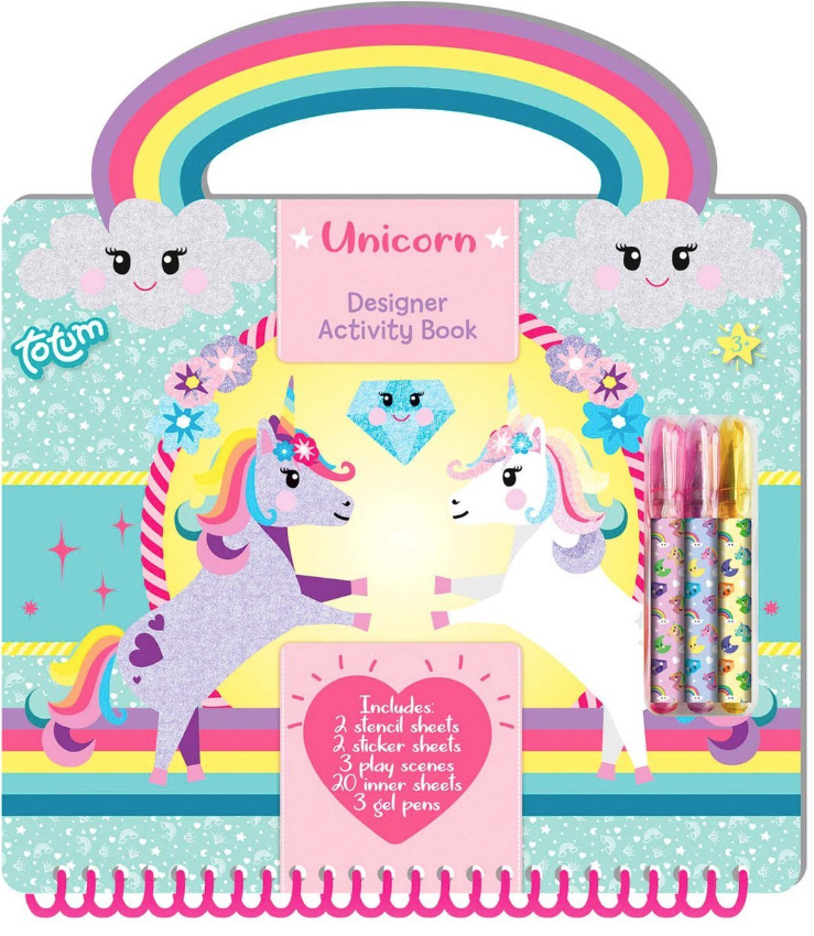 Descopera taramul de poveste al unicornilor si fa-ti propriile creatii cu aceasta carte completa de activitati, perfecta pentru vacanta, dar si pentru acasa.Setul include: 3 pixuri cu gel, 2 foi cu abtibilduri, 2 foi cu sabloane, 3 decoruri pentru a inventa super povesti magice cu unicorni si 10 coli perfecte pentru a-ti da frau liber imaginatiei.Varsta recomandata: 3+Atentie! Nu este recomandat copiilor sub 3 ani. A se utiliza sub supravegherea unui adult.