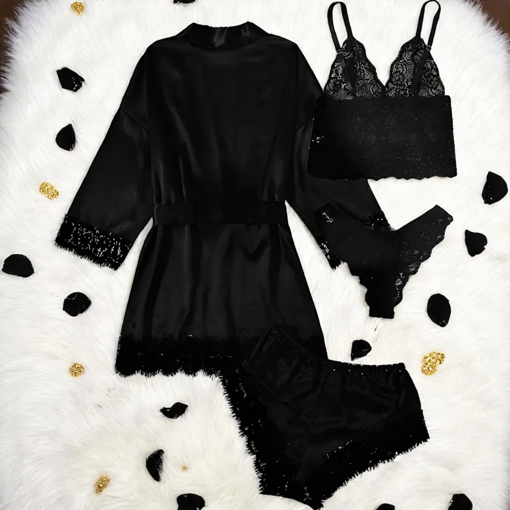 Set Pijamă de Damă 4 Piese din Satin, Culoare Negru – Eleganță Absolută și Rafinament Intim Descoperă luxul simplu și seducția clasică a acestui set pijamă 4 piese din satin negru, creat pentru a-ți oferi un look sofisticat și un confort desăvârșit. Cu un design complet, setul conține un halat elegant cu cordon, un maiou delicat cu detalii din dantelă, pantaloni scurți lejeri și un chilot din dantelă fină, toate într-o nuanță atemporală și rafinată de negru. • Satin neted și lucios – oferă o senzație răcoroasă și un aspect elegant • Maiou cu bretele subțiri și dantelă rafinată – detalii feminine și senzuale • Pantaloni scurți comozi – pentru libertate de mișcare și relaxare totală • Chilot din dantelă fină – completează perfect setul cu un aer sofisticat • Halat lejer cu cordon – ideal pentru a completa ținuta de noapte cu eleganță Acest set complet din satin negru este perfect pentru serile în care vrei să te simți încrezătoare, feminină și răsfățată.Notă: Nuanțele produsului pot varia ușor în funcție de luminozitatea ecranului de pe care se plasează comanda.