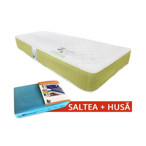Salteaua este acoperită cu stofă Visco, dublu jarse-poliester, capitonată pe ambele fețe. Arcurile cu diametru mic de 56 mm legate între ele cu stofă, au o acțiune individuală. Ambele fețe ale saltelei au caracteristici izolante, superioare. Setul include o husă cu elastic fabricată din bumbac 100% ideală pentru protejarea saltelei pentru o perioadă cât mai îndelungată. CARACTERISTICI TEHNICE: Arc cu diametru 56 mm fabricat din sârmă oțel carbon cu grosime de 1,8 mm si 2,2 mm la dimensiunile de două persoane;Arcurile sunt montate în pachete individuale;Rama laterală oțel carbon 3,5 mm capsată;Înălțime saltea: 24 cm;Spumă poliuretanică densitate mare. Suprafața exterioară: stofă Visco (dublu jarse - poliester);capitonată față-verso cu vată sintetică de 150 g/m2;T.N.T 20 g/m2. INSTRUCȚIUNI DE FOLOSIRE: NU ÎNDOIȚI SALTEAUA!Pentru a nu se deforma salteaua, trebuie așezată pe o suprafață dură, dreaptă și continuă.A se feri de umezeală.La un interval de 1-2 luni salteaua trebuie schimbată de pe o parte pe alta pentru creșterea duratei de folosință.