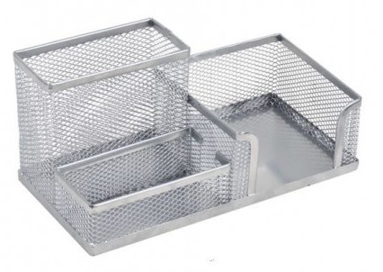 Suport mai multe compartimente, realizat din plasa metalica de culoare argintiu, pentru instrumente de scris, cub hartie, agrafe. Dimensiuni: 20 x 10 x 10 cm, argintiu