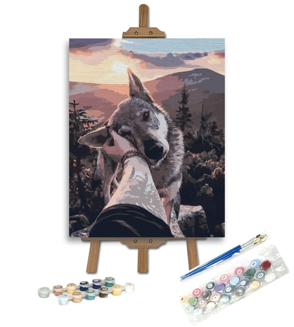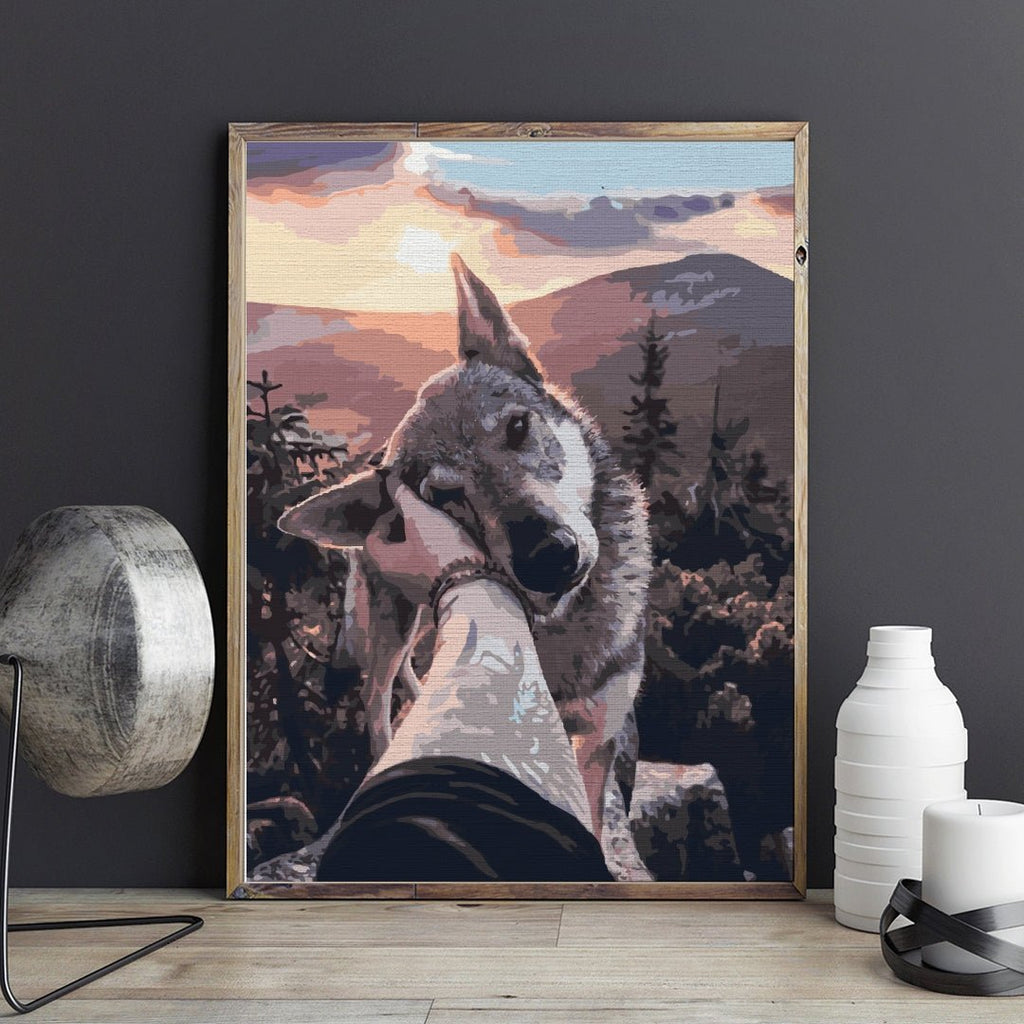 Blândețea și iubirea pot învinge orice barieră, chiar și cea dintre animalele sălbatice și oameni. Cum este si acest tablou pe numere Tamed Wolf în care blândețea din ochii lupului este completarea perfectă a unui peisaj montan.