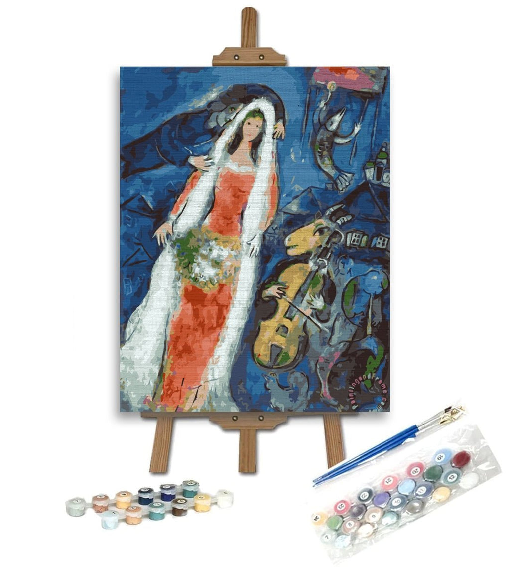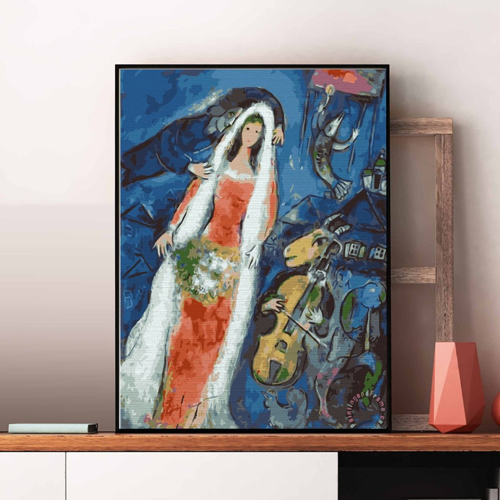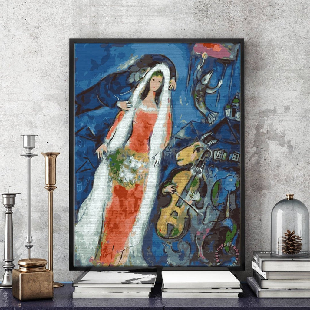 Stilul pictorului modern Marc-Chagall a fost considerat unul deosebit și foarte original. Îi plăcea cultura ebraică. Wedding este o pictură pe numere reprodusă după opera La Mariée. Această lucrare înfățișează lumea reală cu cea imaginară, un amestec de culori vii și o imaginație fără limite, ce dă viață picturii.
