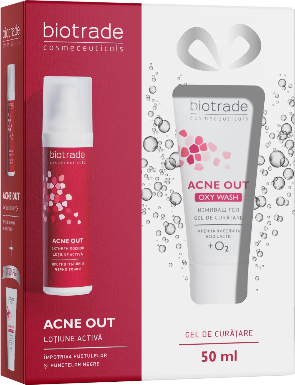Pachet Lotiune Activa Acne Out, 60ml + Gel de curatare Acne Out Oxy Wash, 50ml, Biotrade