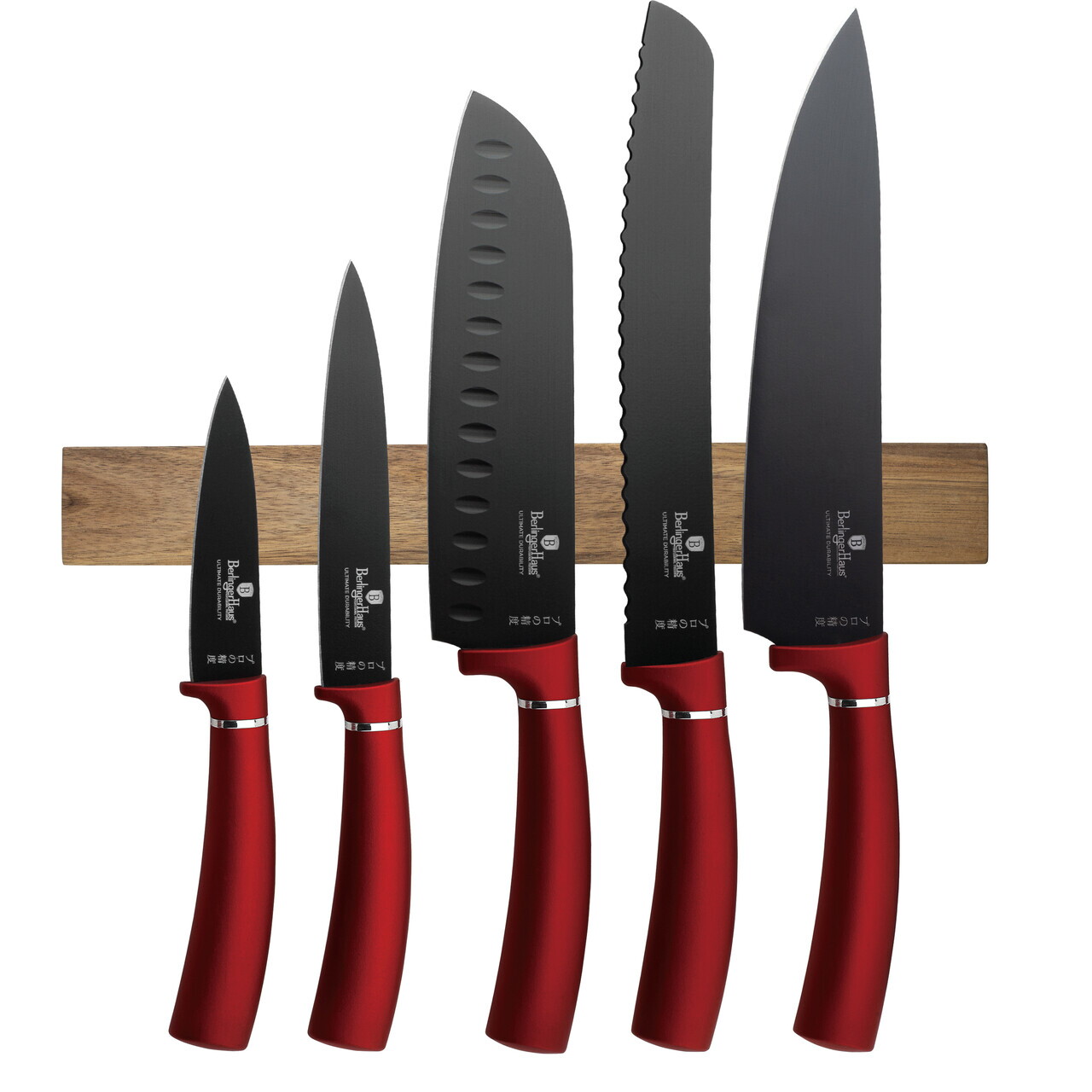 Set 5 cutite cu suport magnetic Berlinger Haus, Burgundy, inox/lemn, rosu/natur