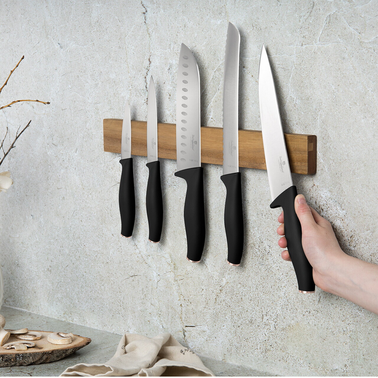 Set 5 cutite cu suport magnetic Berlinger Haus, Matte Black, inox/lemn, negru/natur