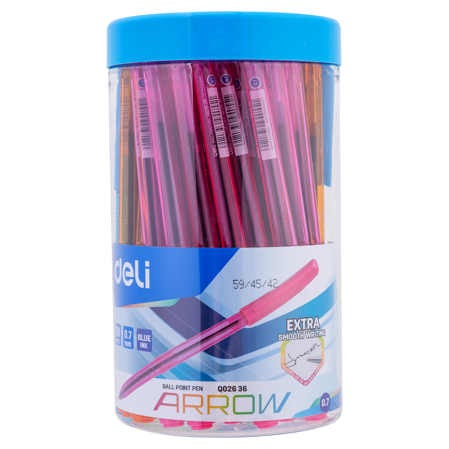 Pix cu capac, albastru, corp diferite culori, varf 0,7mm, 50buc/borcan, DLEQ02636 Deli