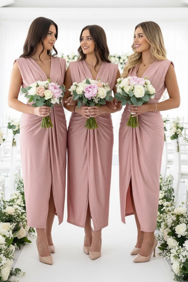 Set 4x Rochie lunga de seara JHOSY, cu paiete, Roz Pudrat, Marime S/M