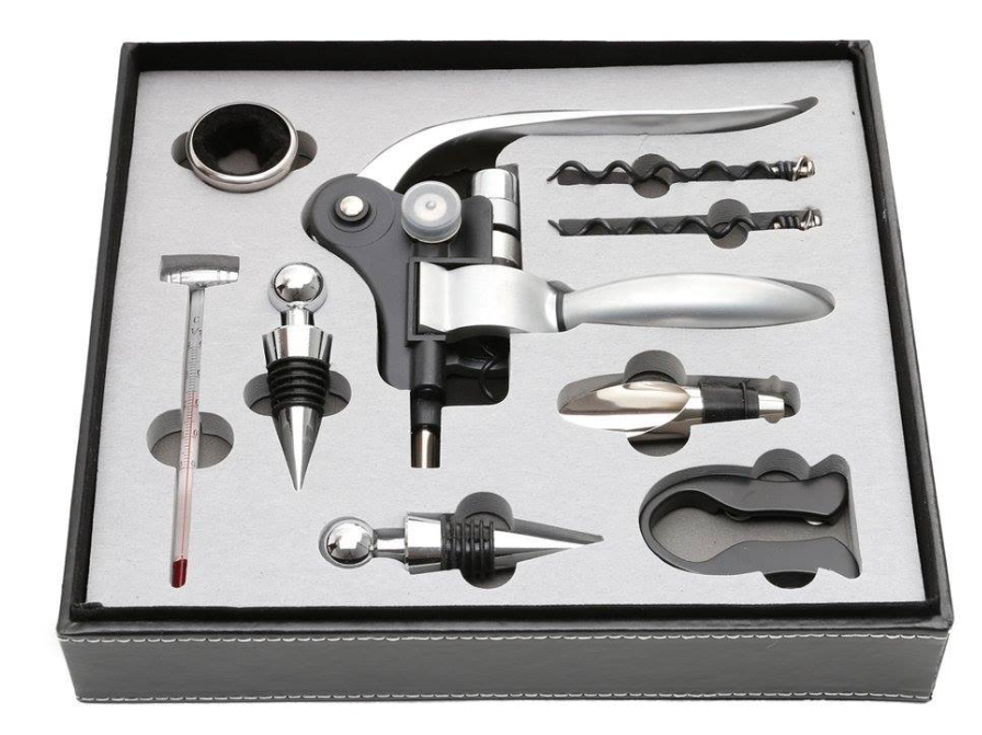 Set premium accesorii profesionale pentru vin in cutie de lemn 9 elemente kitul somelierului