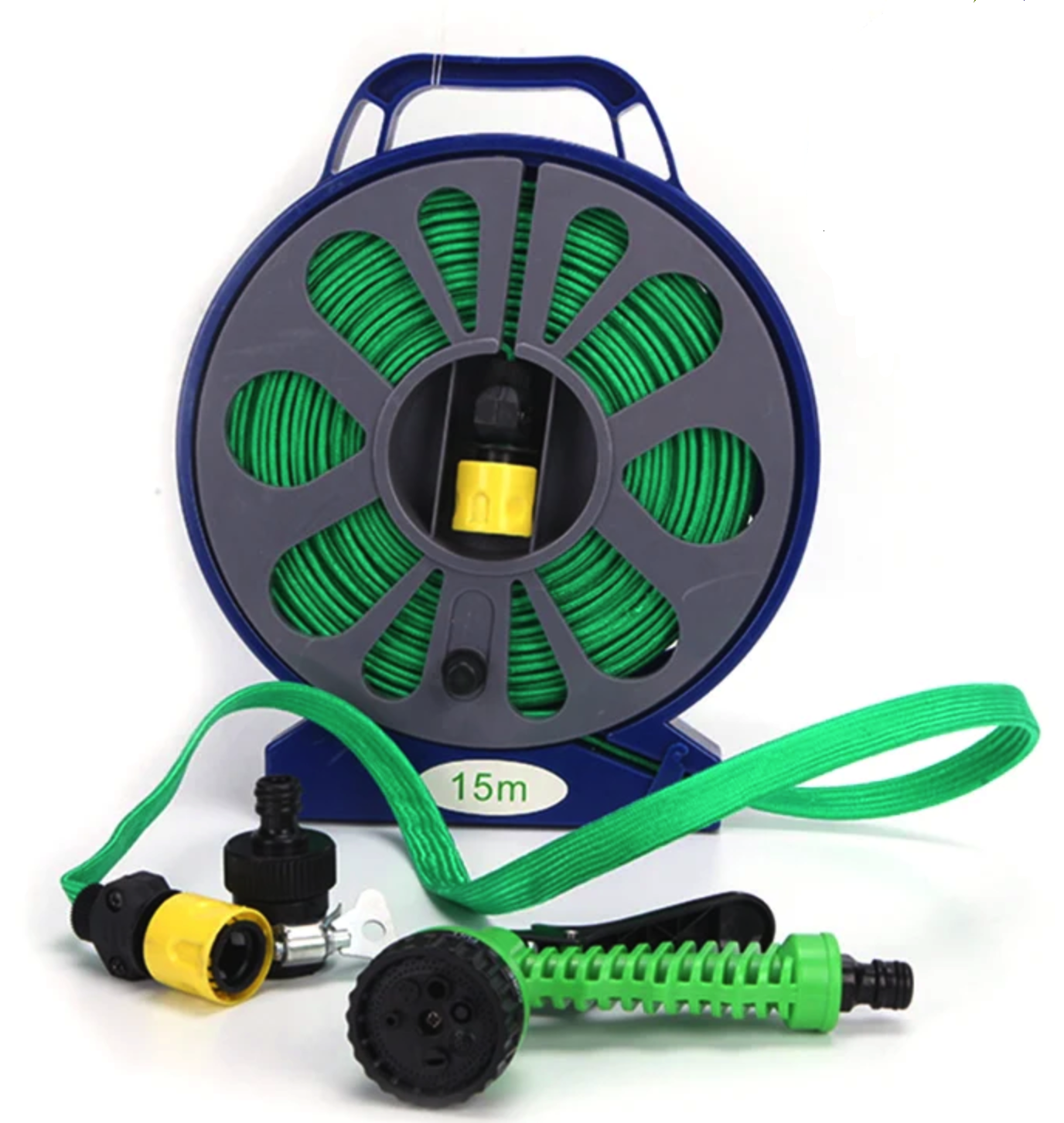 Set pentru stropit furtun textil flexibil 15m cu tambur pistol de pulverizat 7 in 1