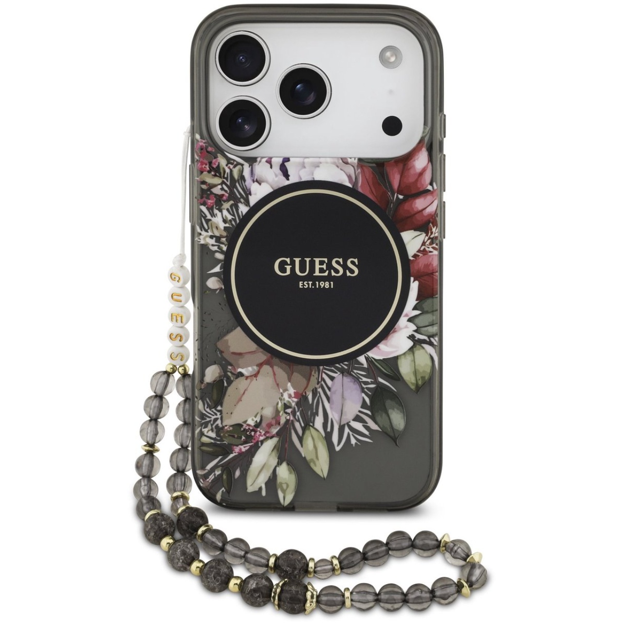Husa de protectie pentru iPhone 17 Pro, negru, Flowers Strap MagSafe, Guess