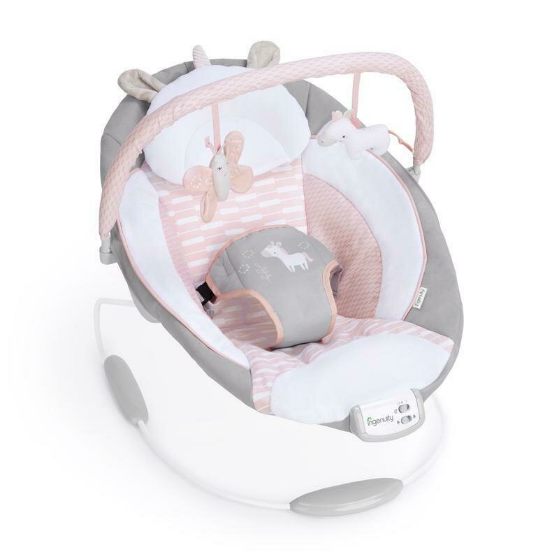 Balansoar electric bebelusi, Ingenuity, Comfort 2 Go, Flora the Unicorn, 2 pozitii inclinare, 12 melodii, Temporizator 30/45/60 min, Centura siguranta 5 puncte, Pliabil pentru calatorii, Fara BPA, 0-9 luni, Roz