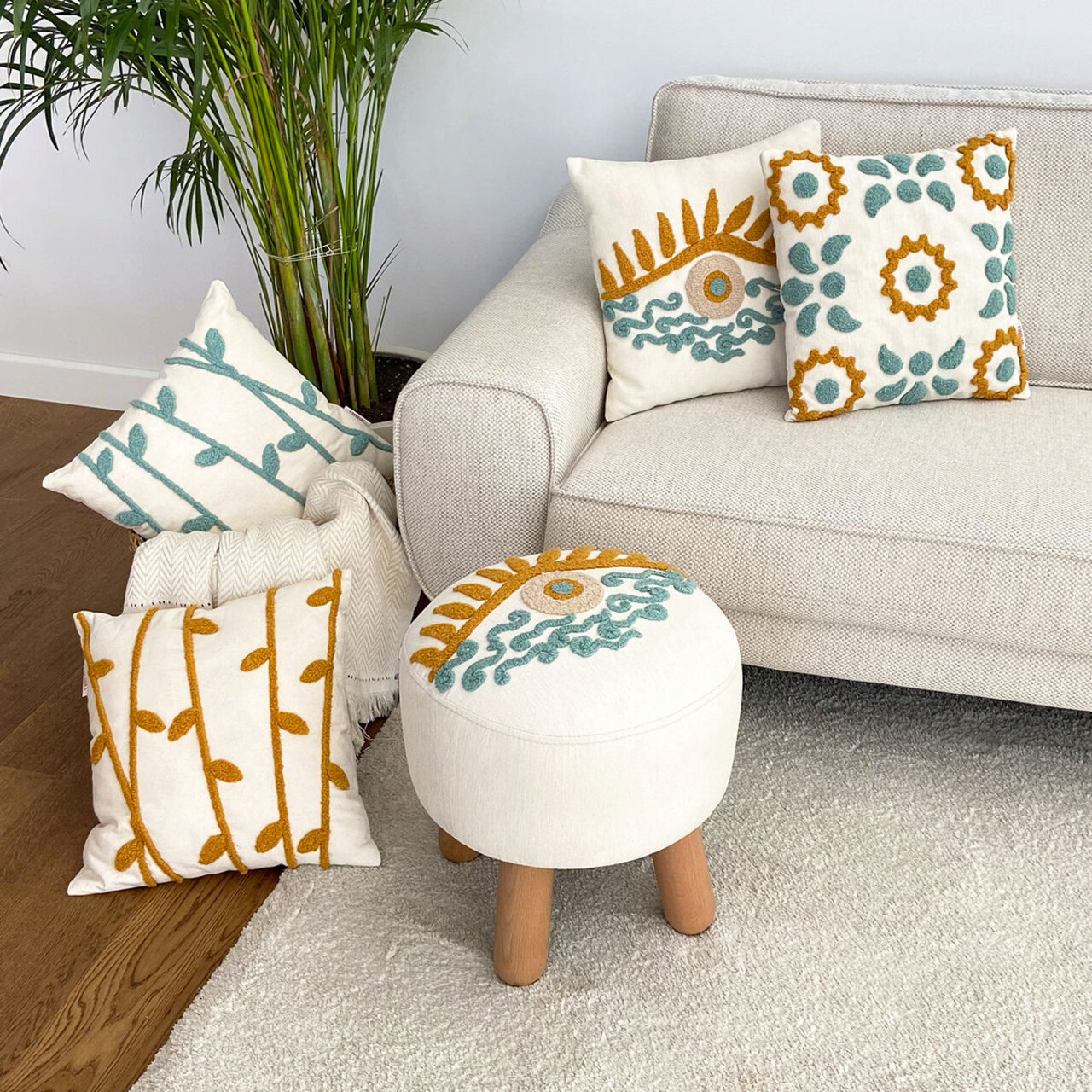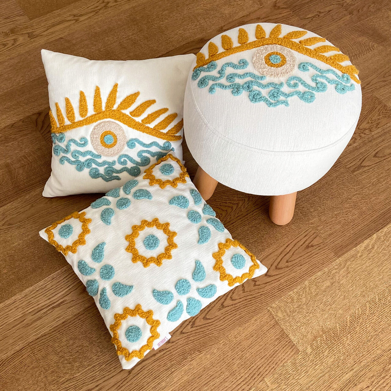 Set puf și pernă, Sunny Fate, Mustar / Menta / Albastru