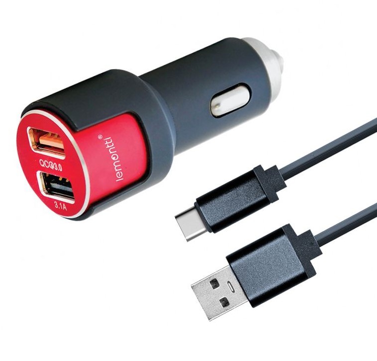 Incarcator Auto Lemontti LIAQ3TCNR3A, 3.1A, 2 x USB, Qualcomm 3.0, cablu Type-C (Negru/Rosu)