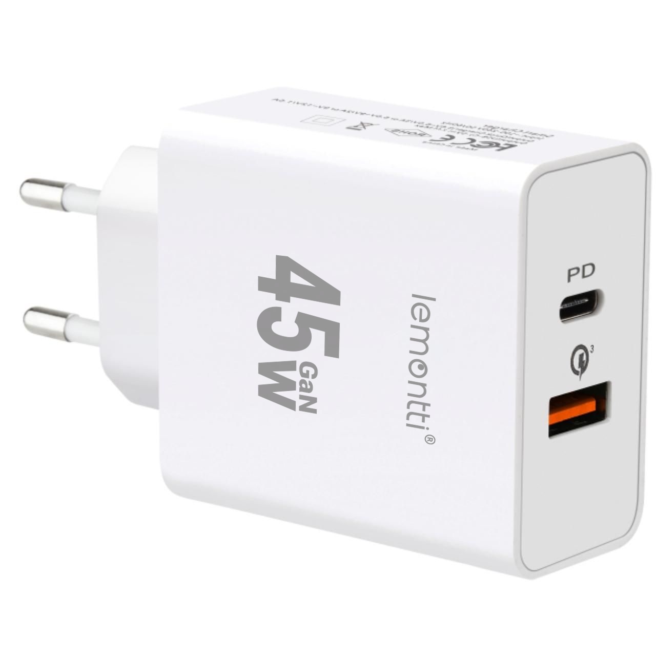 Incarcator retea, USB si USB-C, 45W, GaN Fast Charge, alb, Lemontti