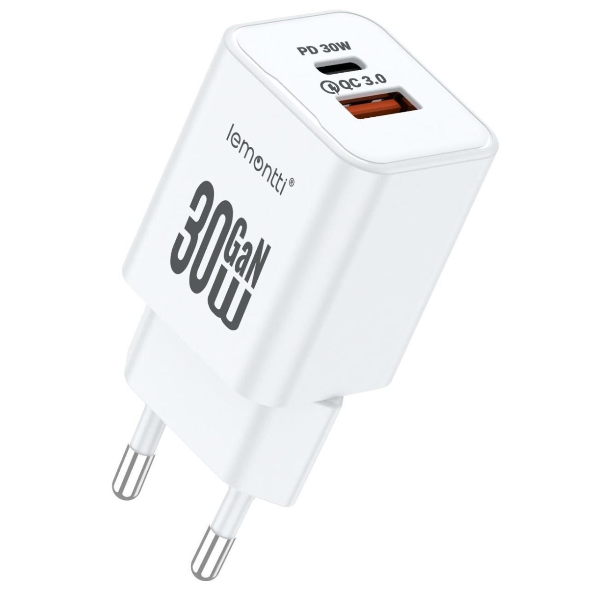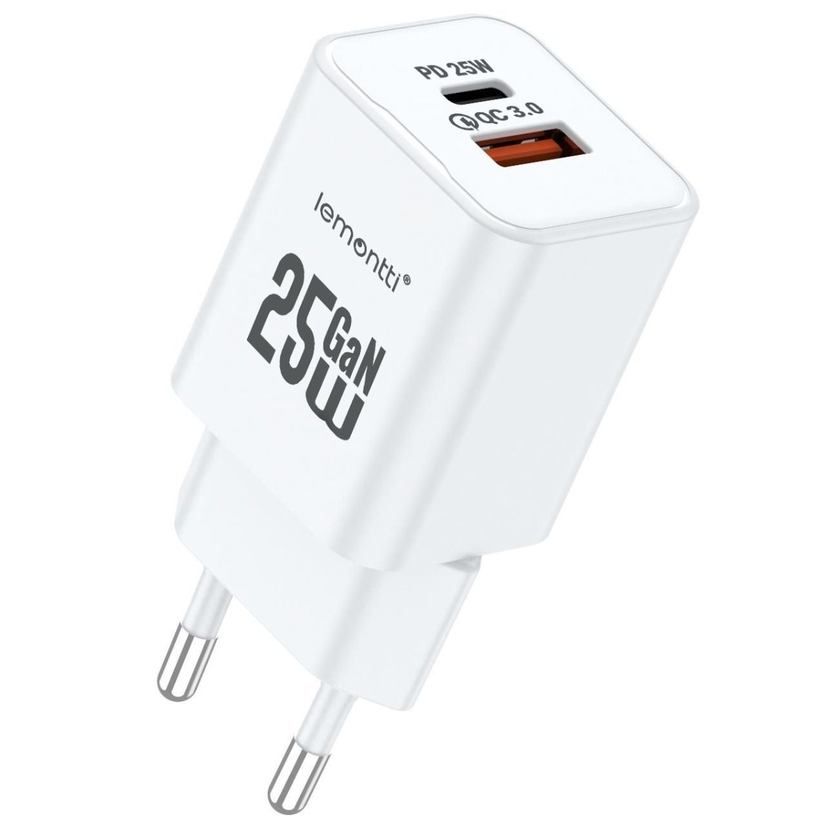 Incarcator Retea Lemontti GaN Dual Port 1x Type-C si 1x USB-A, 25W, EU Plug, Alb