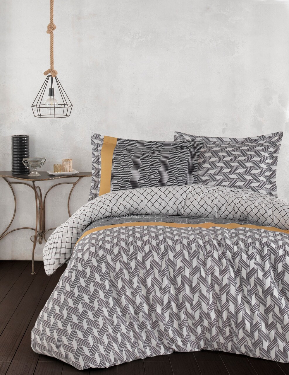 Lenjerie de pat dubla 4 anotimpuri, Lessentiel Maison, Molly, Bumbac Ranforce, Antracit / Alb / Gri