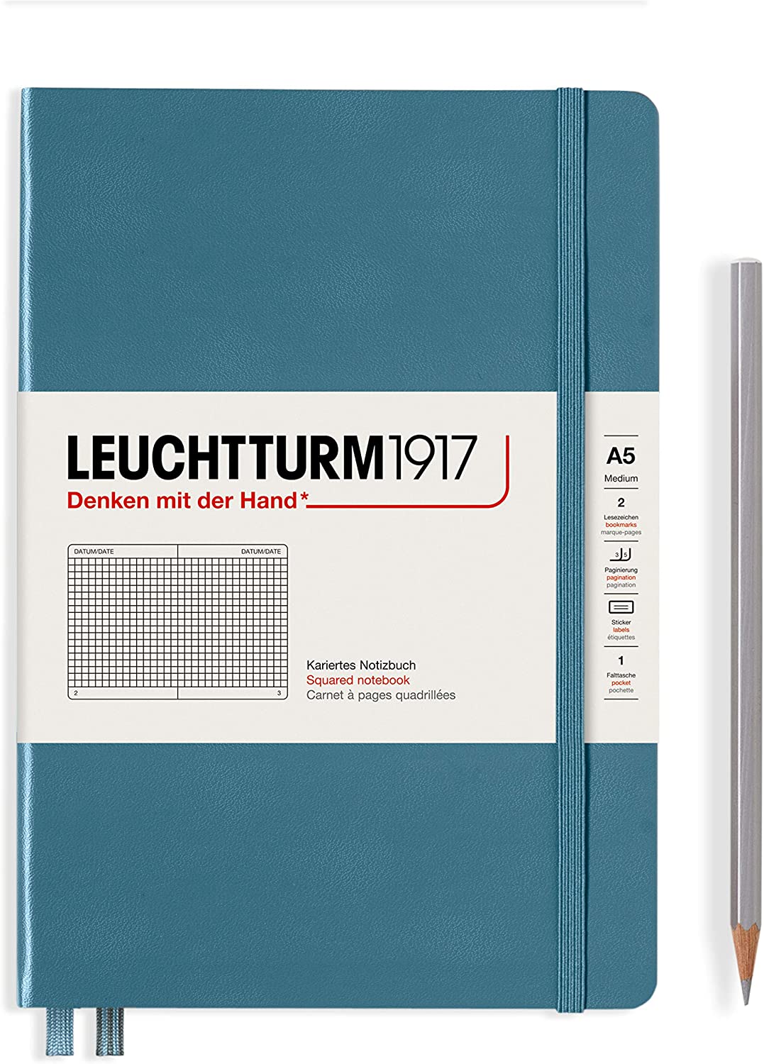Caiet A5, 125file, matematica, coperta carton rigid, albastru piatra, LEUCHTTURM LT363336