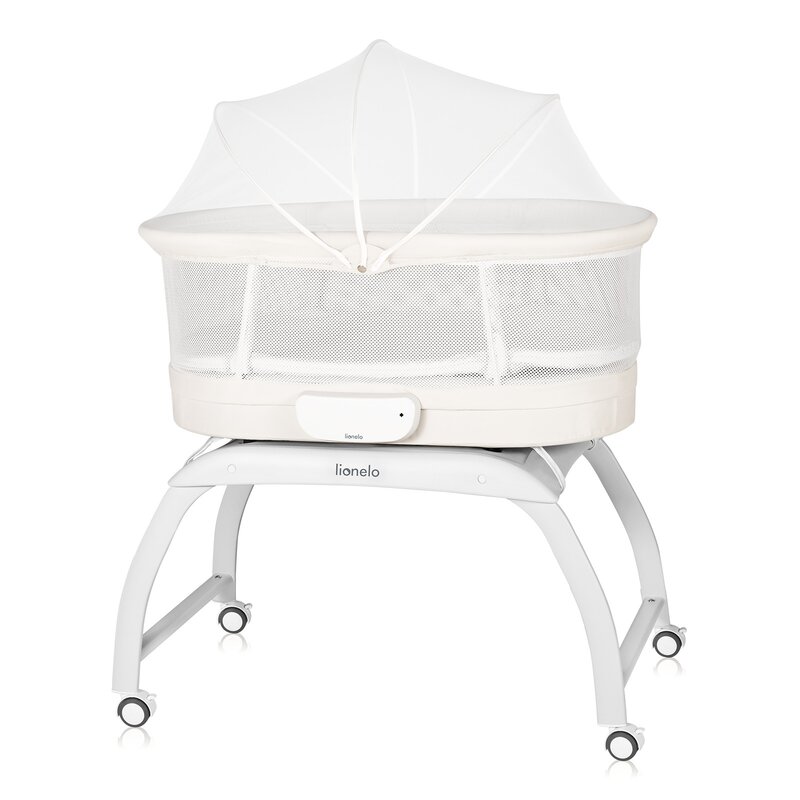 Patut balansoar, Lionelo, Coral, Cu landou ergonomic detasabil, Functie de balansare integrata, Functie de cantar, Sunete si cantece de leagan, Cu roti, Panou tactil sau telecomanda, 0-9 kg, EN 1130:2019+AC:2020,EN 16890:2017+A1:2021, Alb