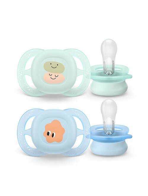 Set 2 suzete, Philips Avent, Colectia Ultra Start, Ortodontice, Fara BPA, Sustenabile, Conceputa pentru gurite micute, Pentru noapte, Fosforescente, 0-2 luni, Cu model, Verde/ Albastru