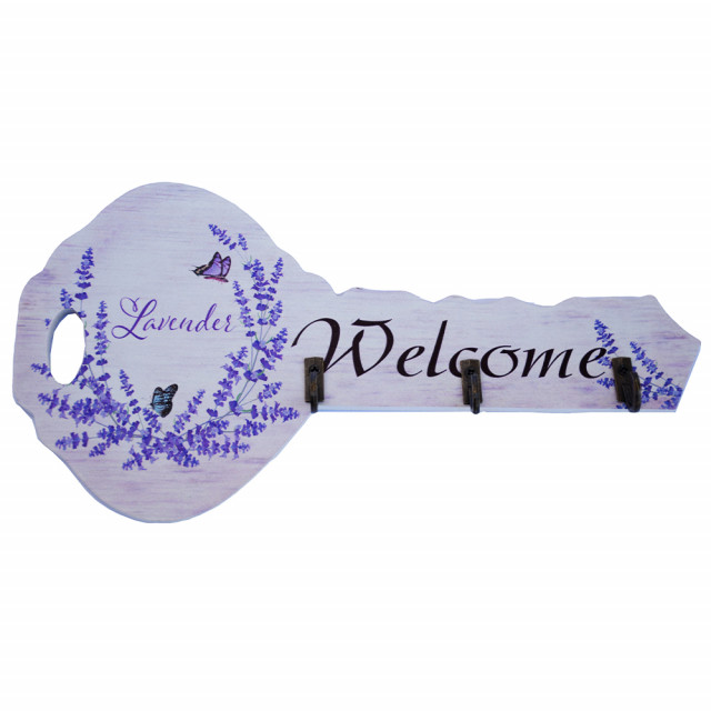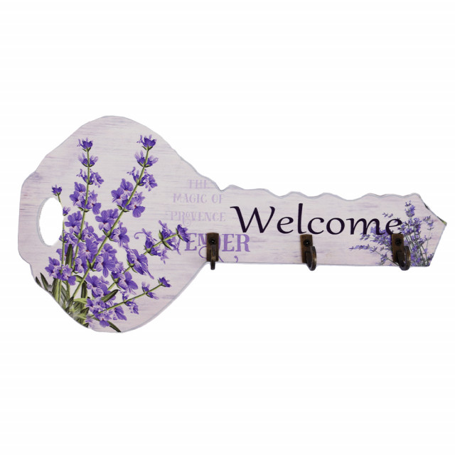 Cuier decorativ suport din lemn Pufo Lavender pentru chei, in forma de cheie, 24 cm