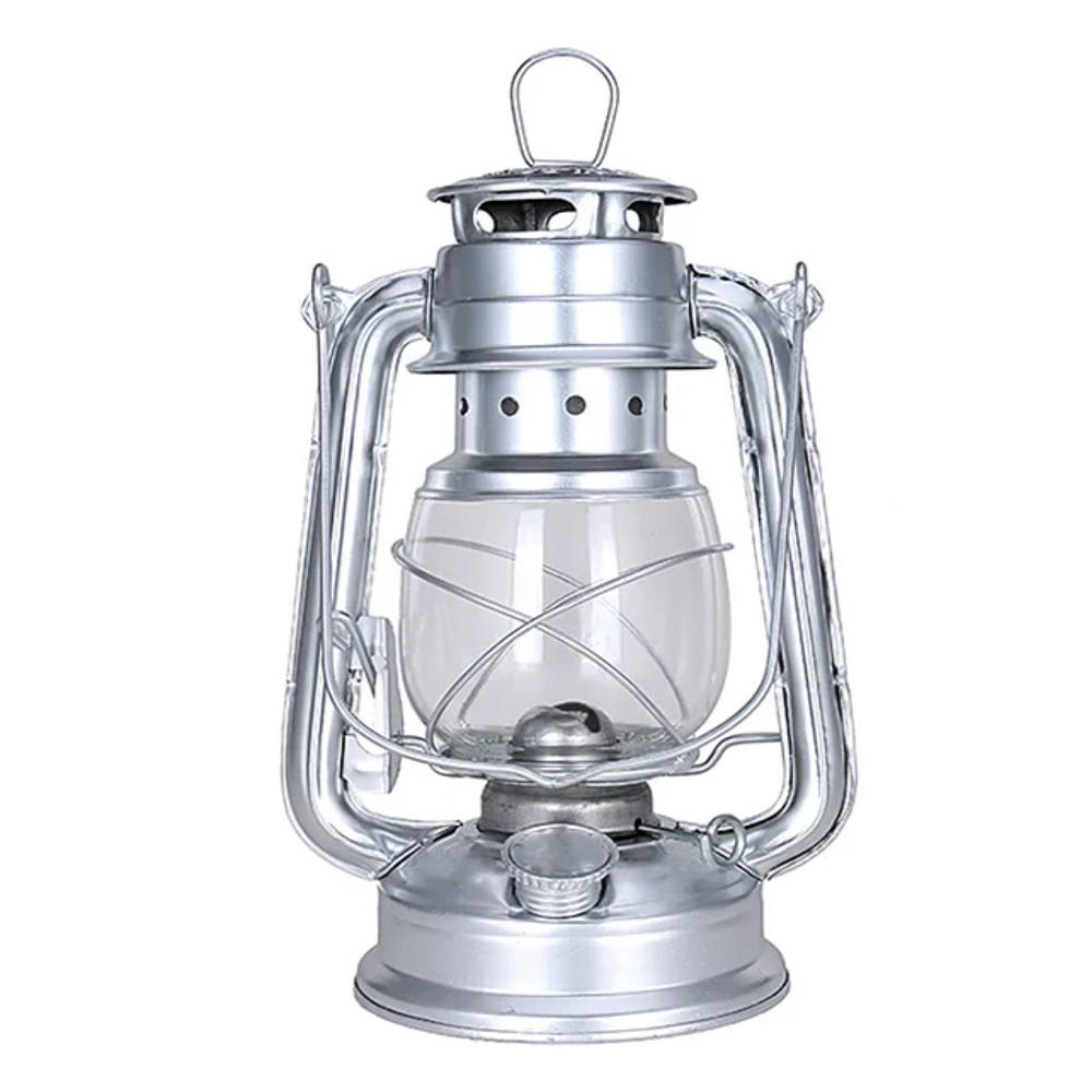 Felinar metalic Pufo Retro pe ulei lampant cu fitil, 24 cm, argintiu
