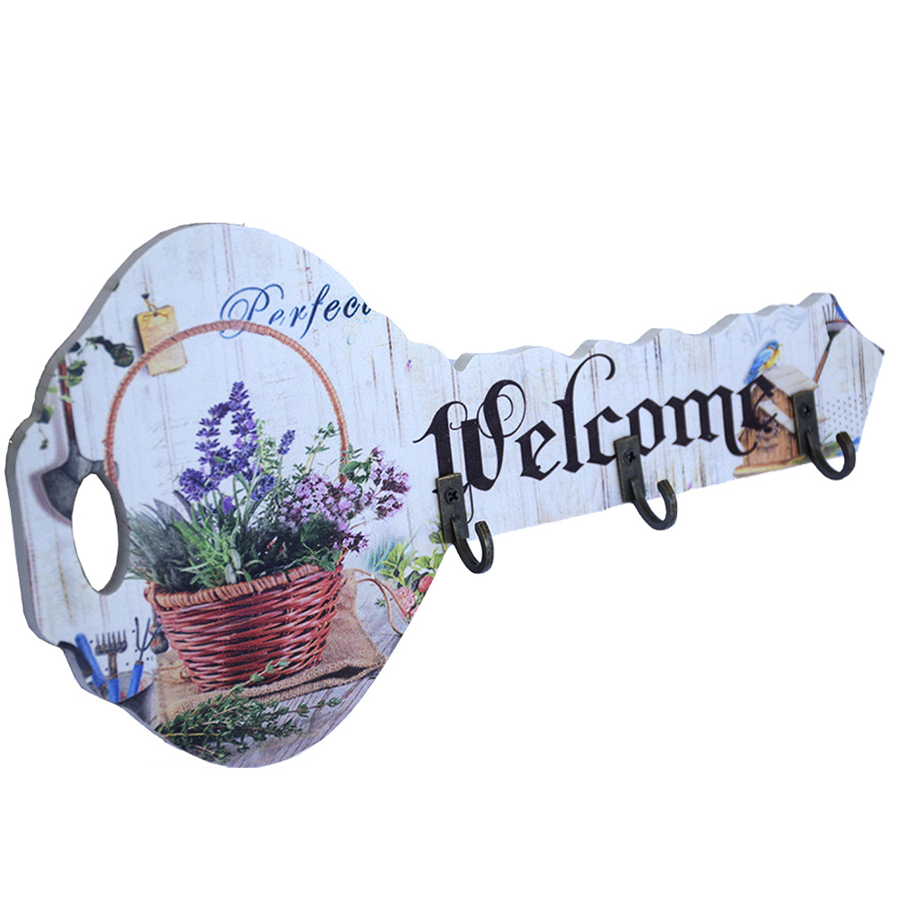 Cuier decorativ suport din lemn Pufo Welcome pentru chei, in forma de cheie, 24 cm