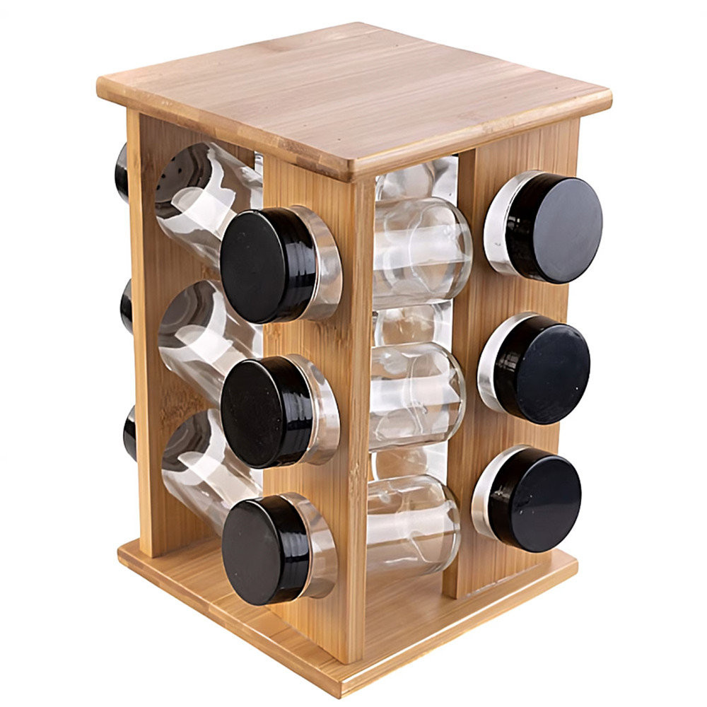 Suport rotativ din lemn de bambus pentru condimente cu 12 recipiente din sticla, 24 x 15 cm