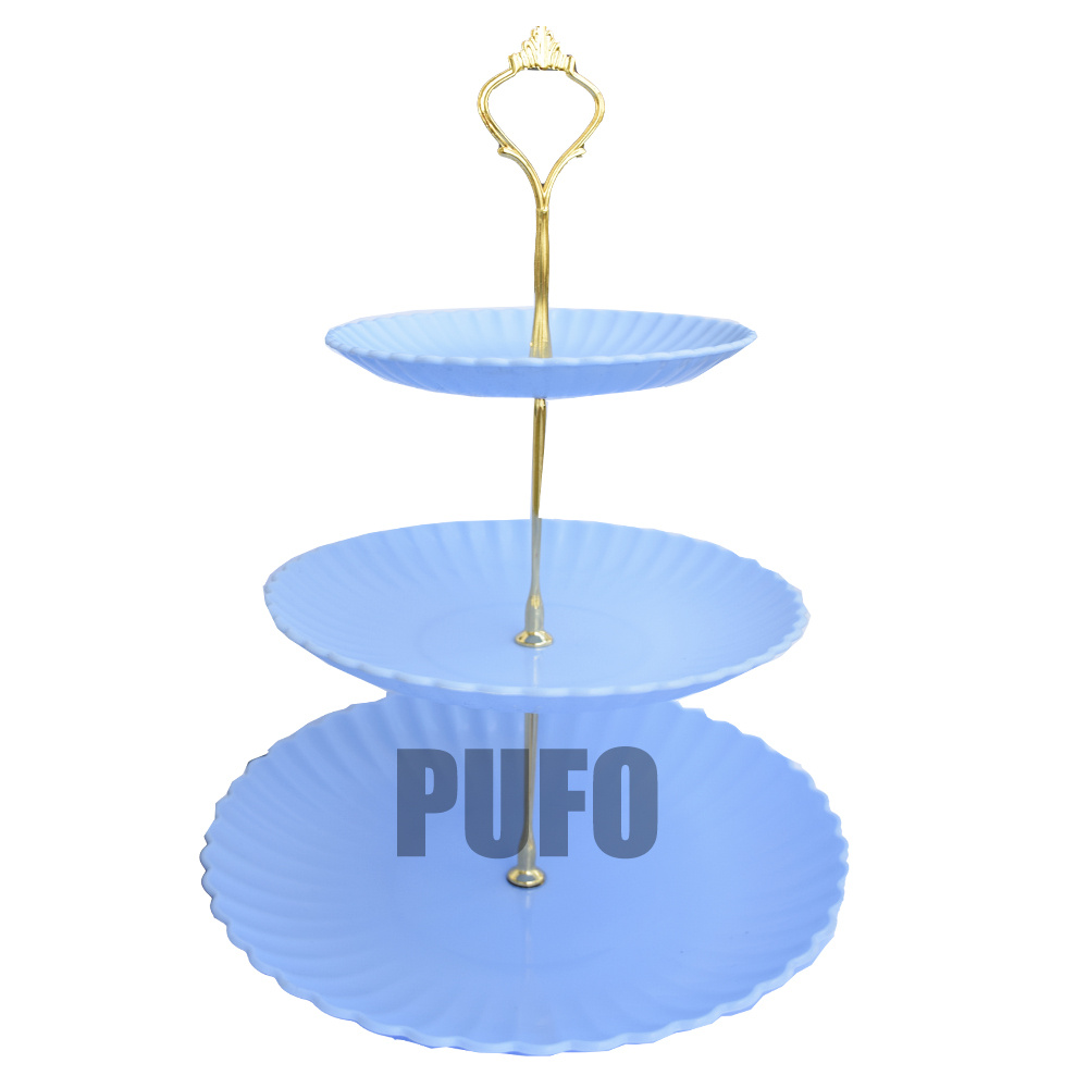 Fructiera etajata Pufo Candy cu 3 nivele, pentru prajituri, torturi, fructe, aperitive, maner metalic, albastru