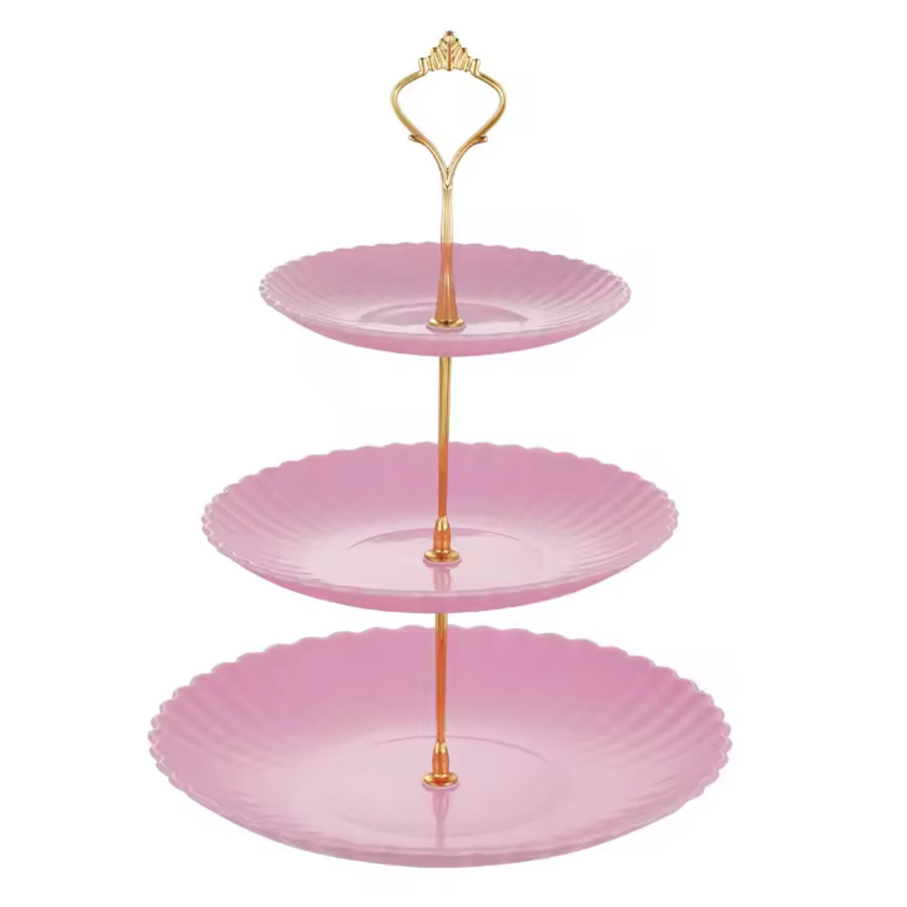 Fructiera etajata Pufo Candy cu 3 nivele, pentru prajituri, torturi, fructe, aperitive, maner metalic, roz