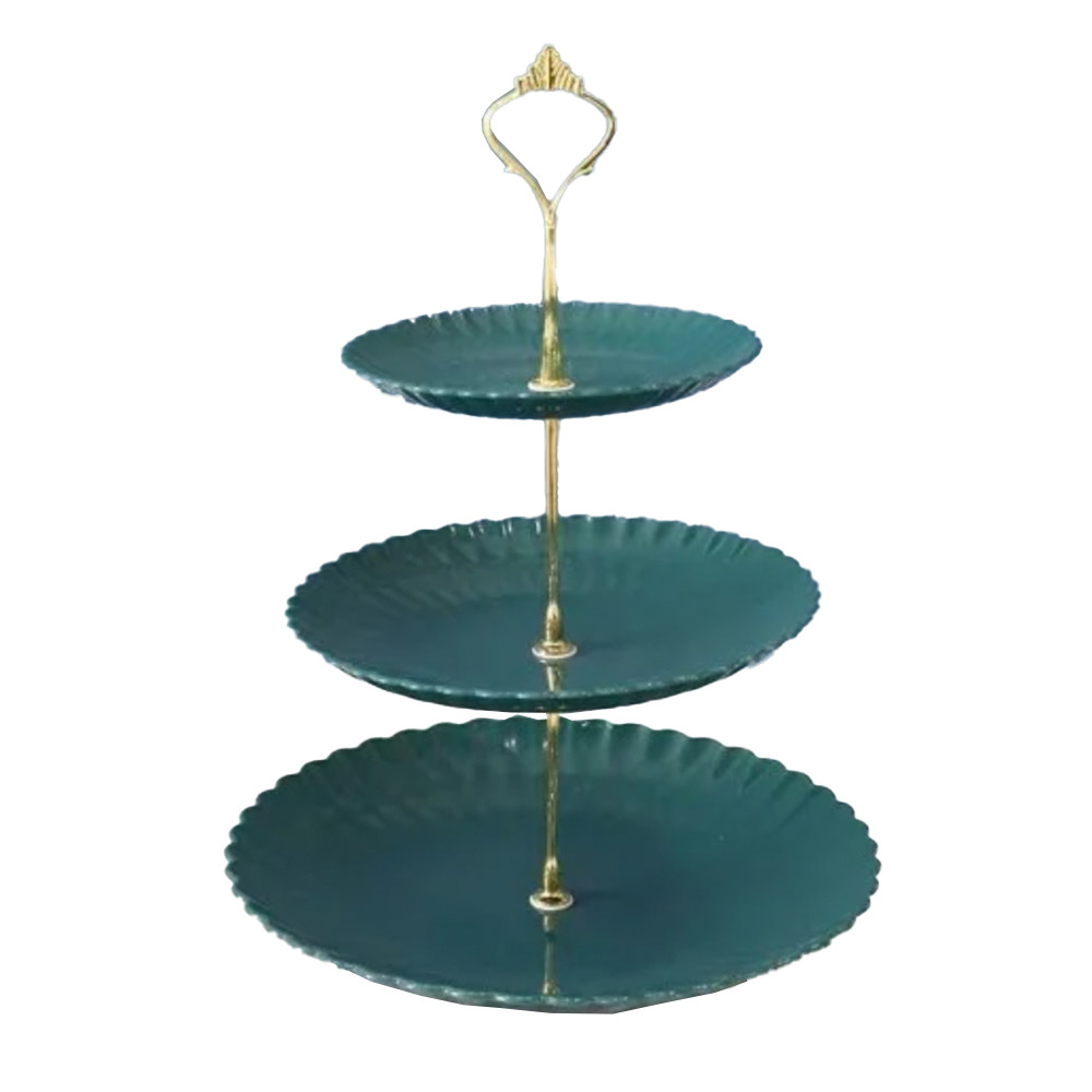 Fructiera etajata Pufo Candy cu 3 nivele, pentru prajituri, torturi, fructe, aperitive, maner metalic, verde
