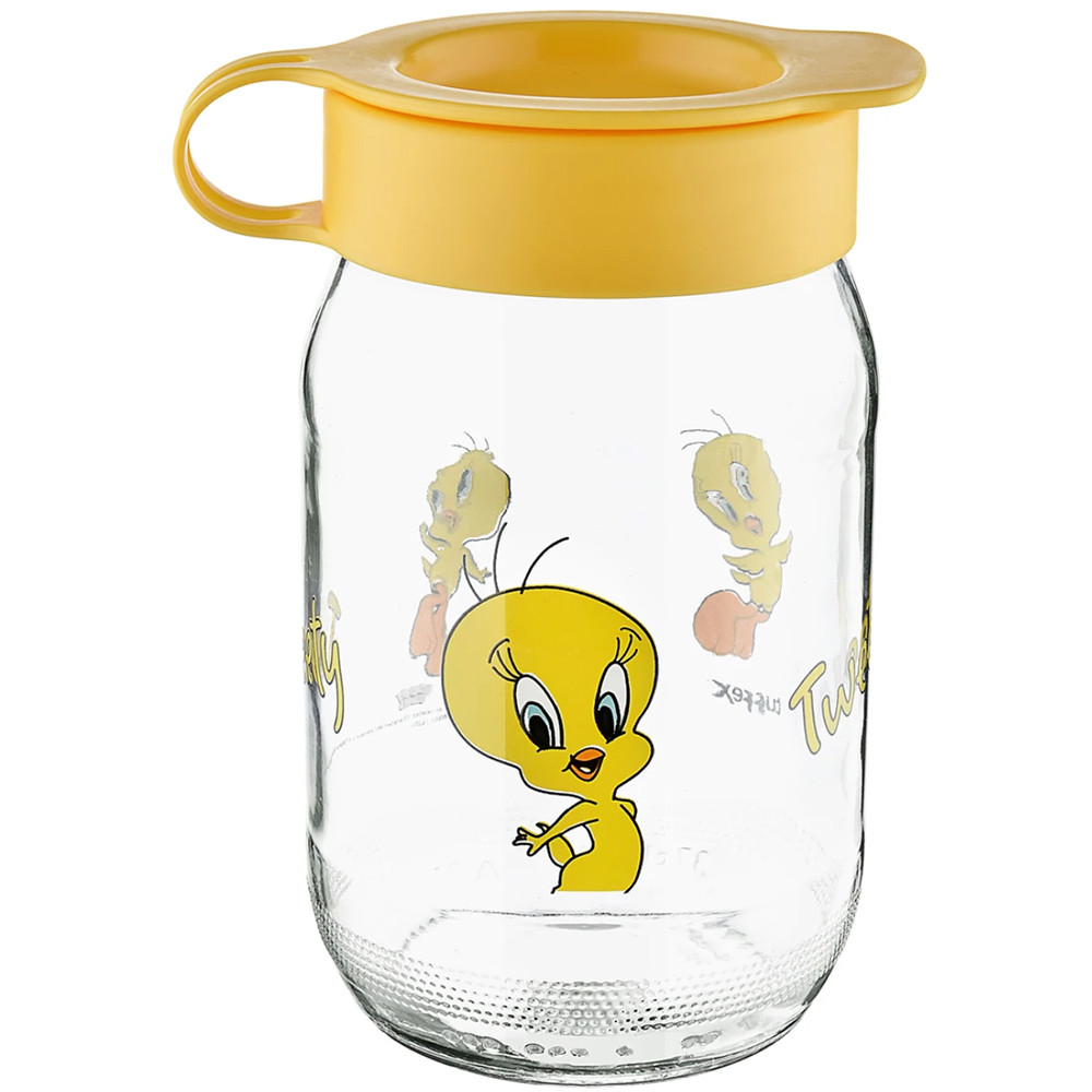 Borcan din sticla cu lingurita si capac Tweety pentru depozitare, servirea mesei la copii, 13 cm