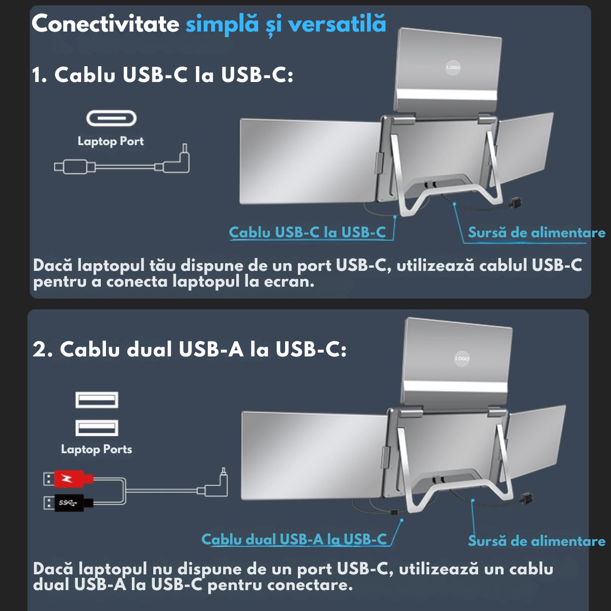 Monitor Extensibil si Portabil pentru laptop, Qova®, 3 Ecrane Full HD 1200P de 14 inch, sRGB 100%, pliabile si rotative