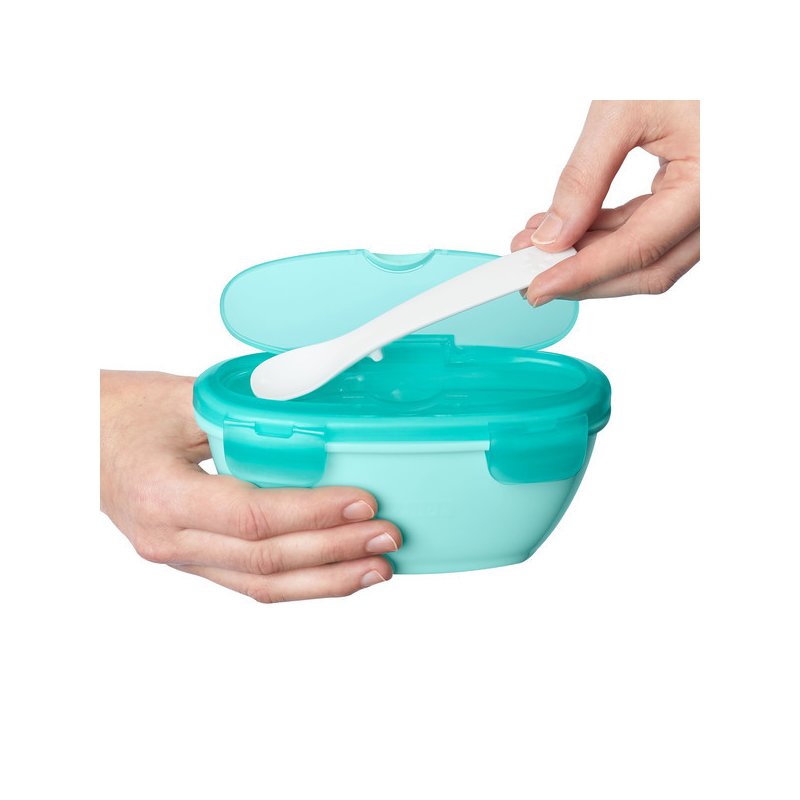 Set de masa, Skip Hop, Pentru calatorii, Include bol si lingurita, Capac rezistent, Fara BPA, 240 ml, 3 luni+, Turcoaz