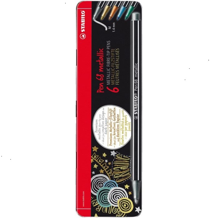 Carioca 6 culori/set, varf 1mm, culori metalizate, cutie metal, Pen 68 Stabilo SW6806832