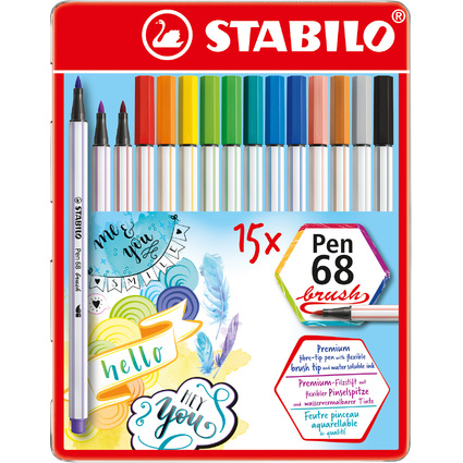 Carioca 15 culori/set, varf tip pensula, cutie metalica, Pen 68 Stabilo