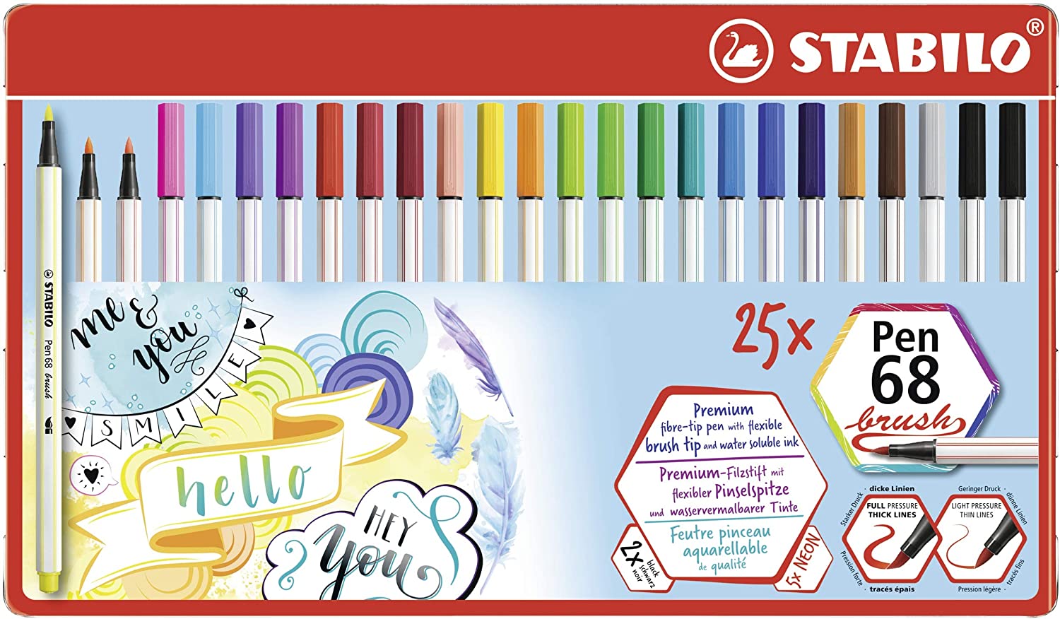 Carioca 25 culori/set, varf tip pensula, cutie metalica, Pen 68 Stabilo SW5682532/ 56825-311